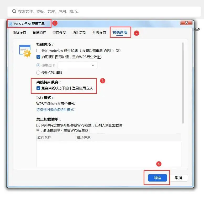 第二步:然后在调出“WPS Office 综合修复/配置工具”窗口中,点击【高级】→在弹出的“WPS Office 配置工具”窗口中选择【其它选项】,勾选【兼容离线状态下的未登录使用方法】,最后点击【确定】即可