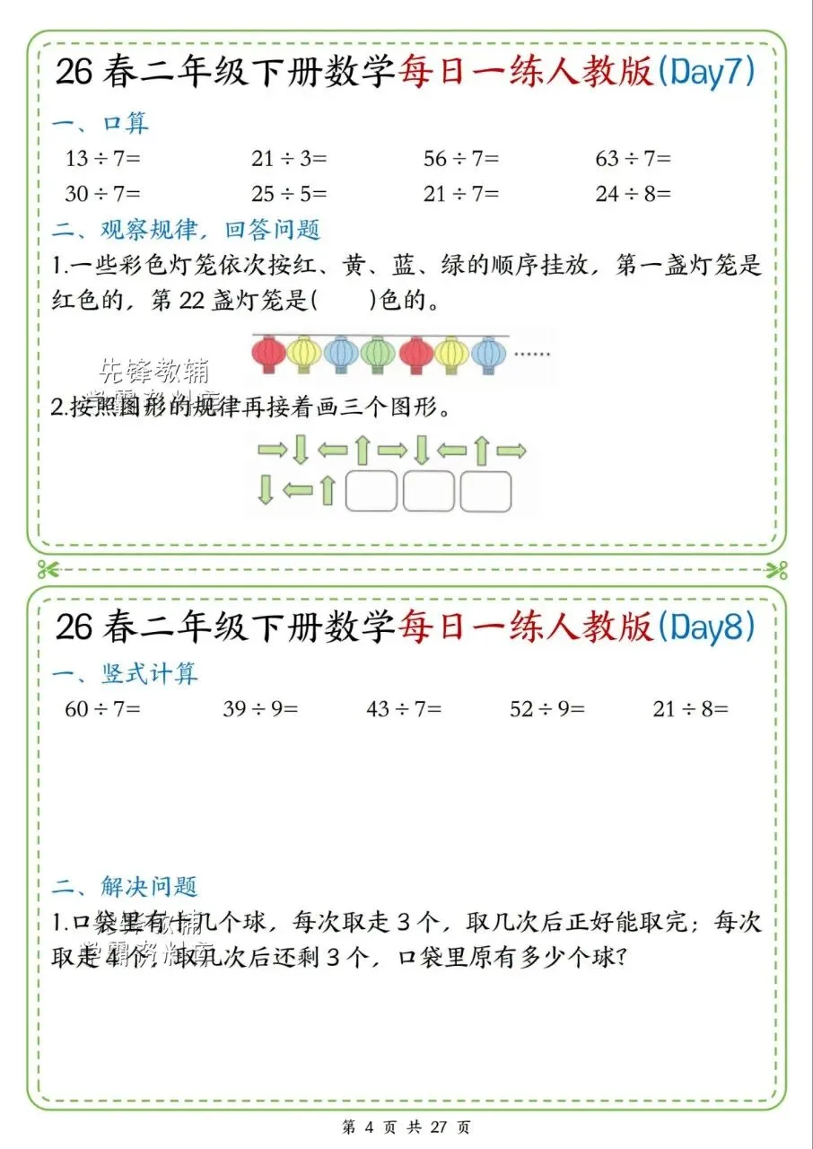 今日分享:2026新版二年级数学下册《每日一练》