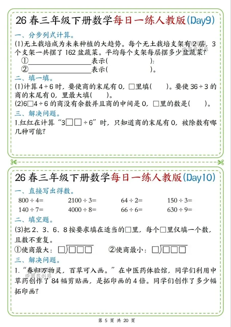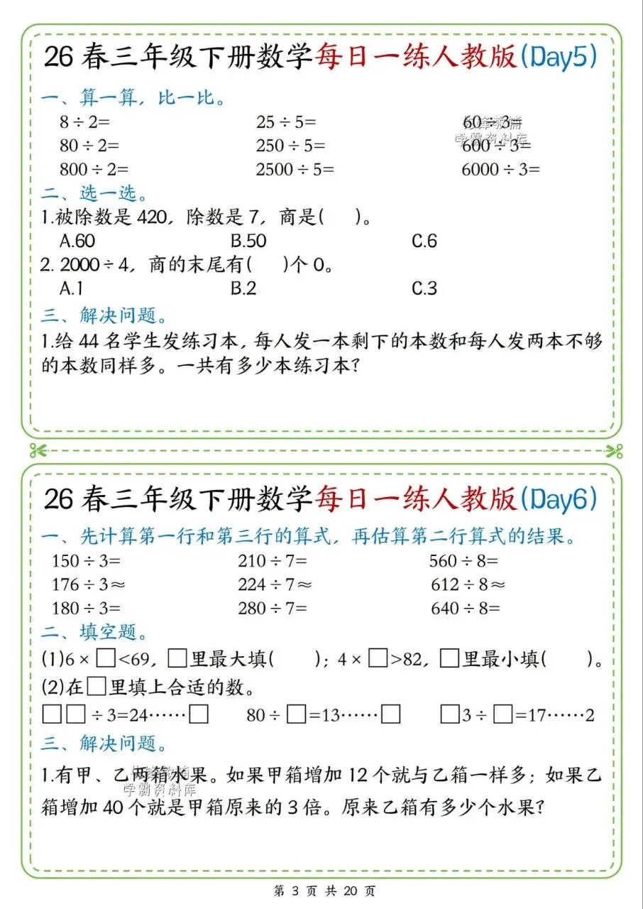 这套三年级下册数学练习贴合人教版,先学图形知识再练除法运算,由浅入深好掌握。题型有计算、填空、应用题,每天练一点,既能巩固课堂知识,还能锻炼孩子解决实际问题的能力。