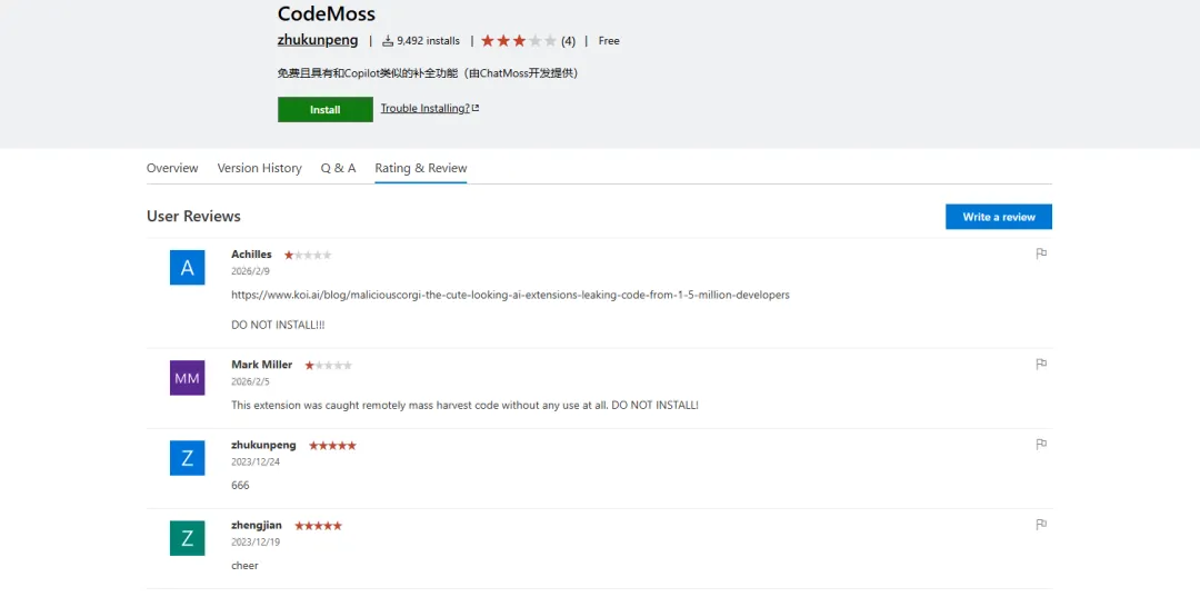插件市场页面出现多条差评,附带指向安全公司 Koi Security 调查报告