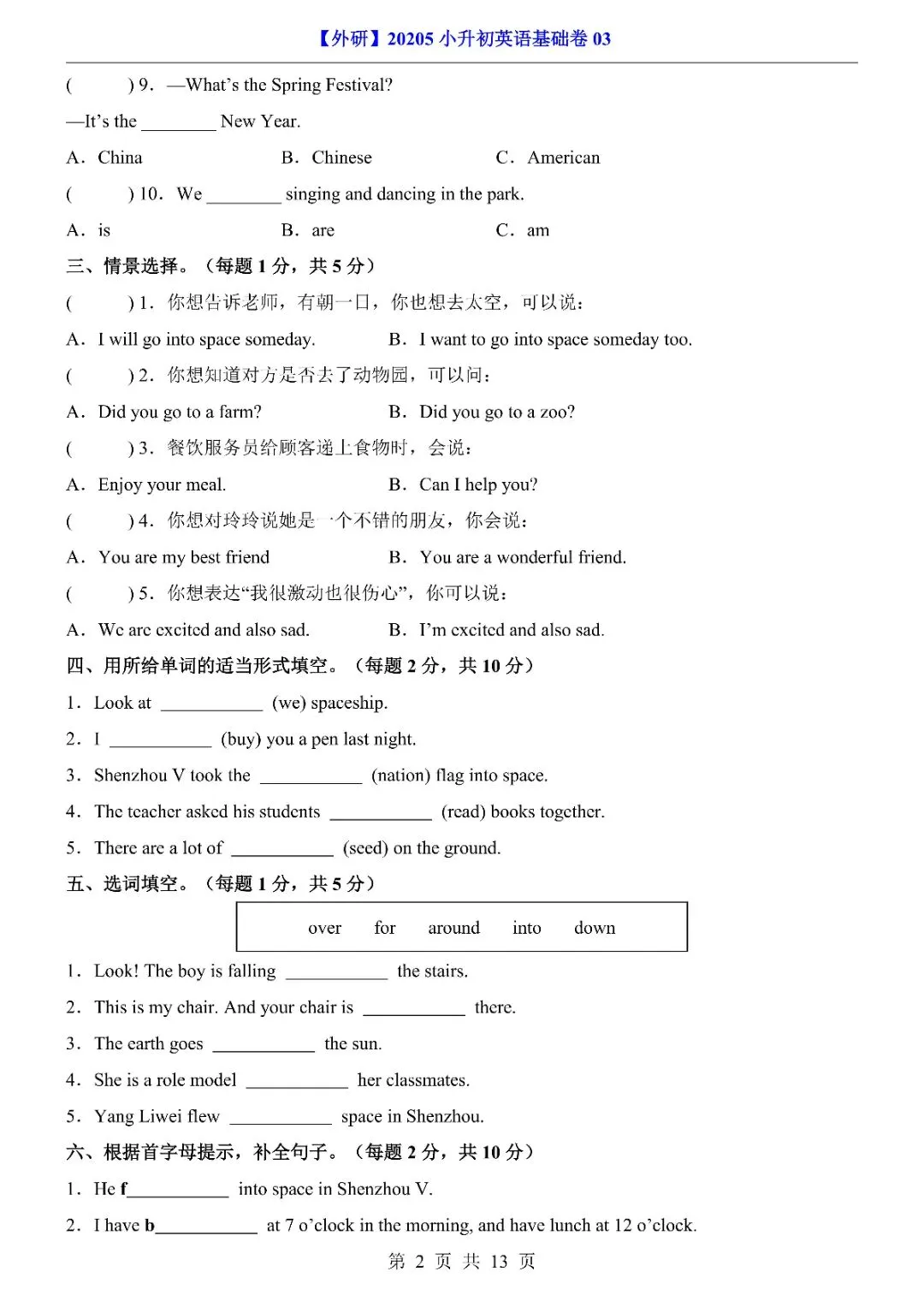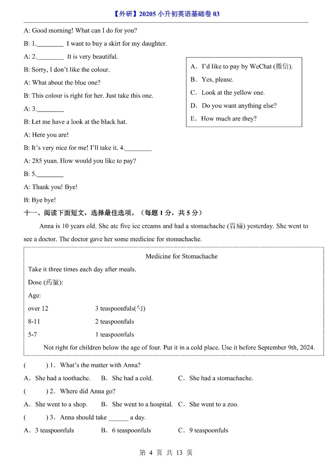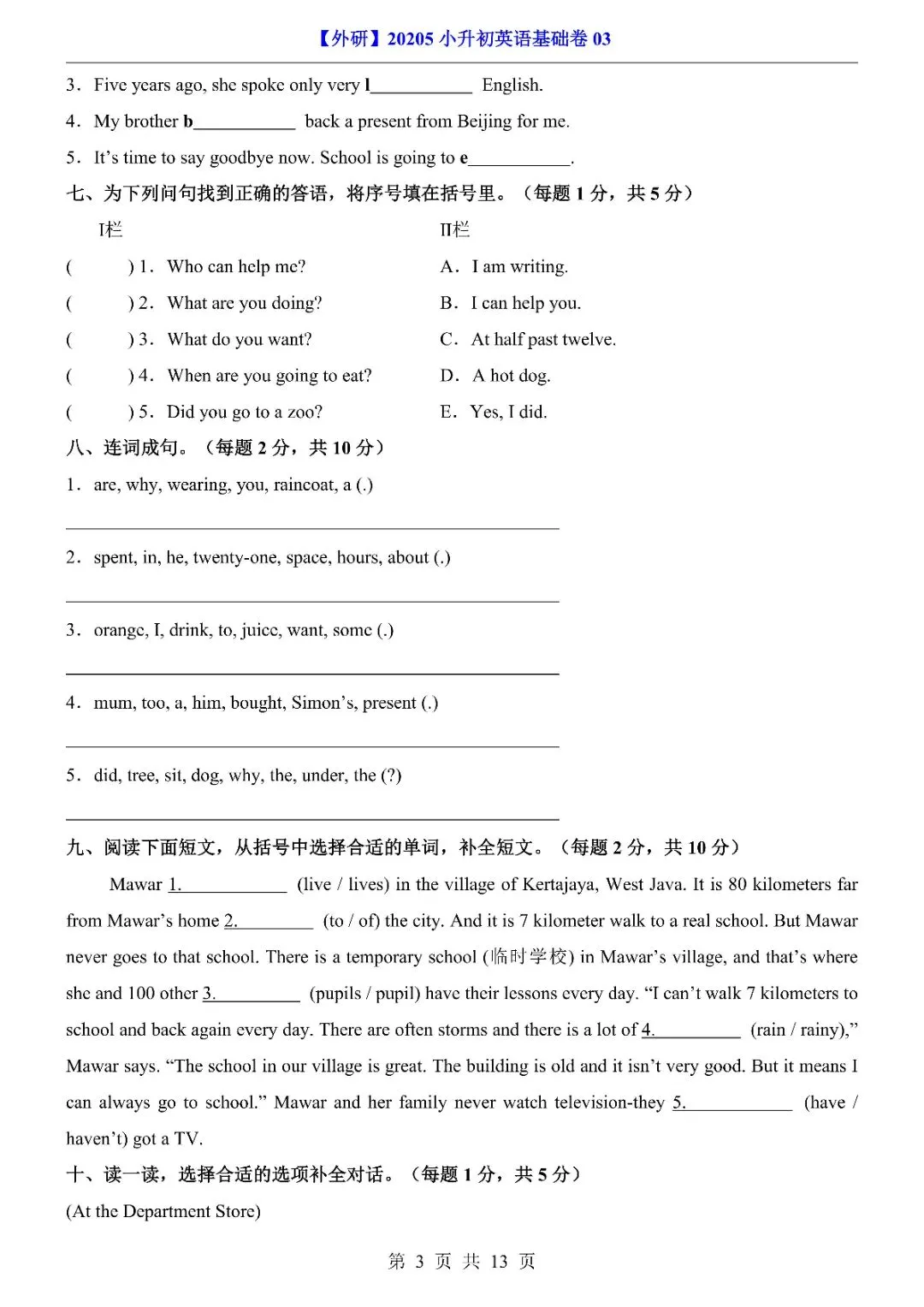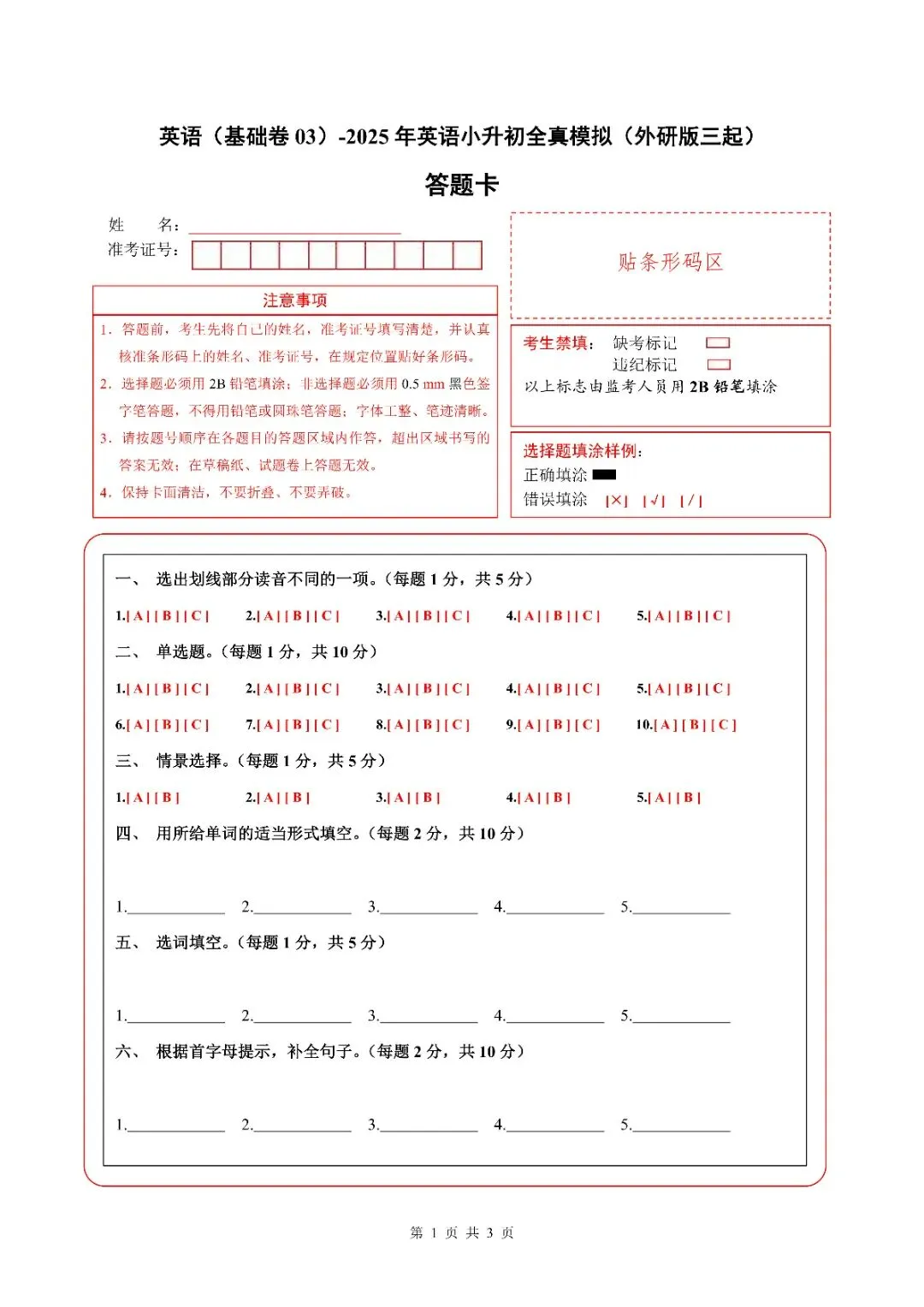 26年春《小升初外研英语基础卷03》完整电子版,有答案,文末有下载链接