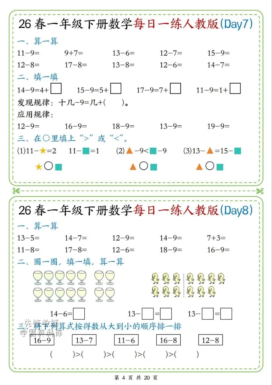 这份资料适配人教版一年级下册,以每日一练形式展开,主打20以内加减法计算基础,搭配图形认知、拼组及简单应用题,由浅入深梯度合理。还融入计算规律探究,兼顾基础巩固与思维启蒙,题型贴合课内,适配日常课后小练。家长快给孩子安排起来吧💪