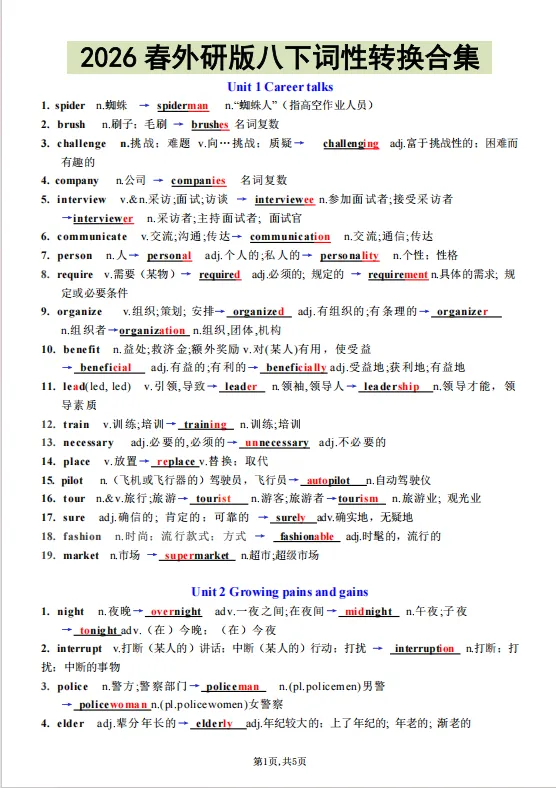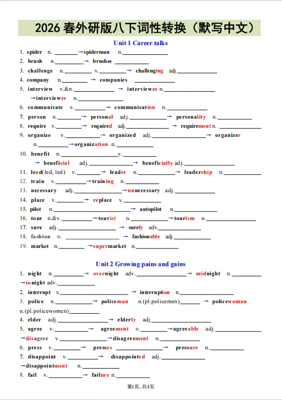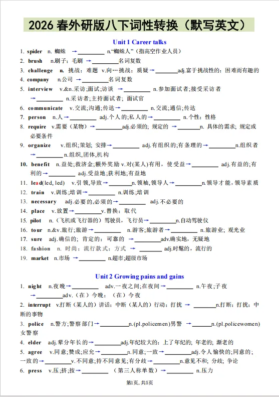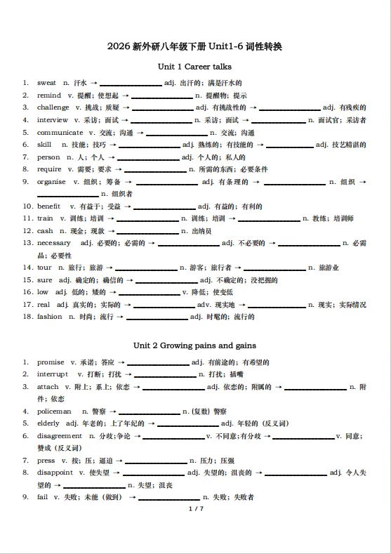 2026年春新八年级下册英语外研版《词性转换合集》含答案,电子版可下载可打印。词性转换是单选、完形、语法填空、短文填空、单词拼写的必考点,这份资料直接练考试高频考点。帮助学生快速扩大词汇量,夯实语法基础