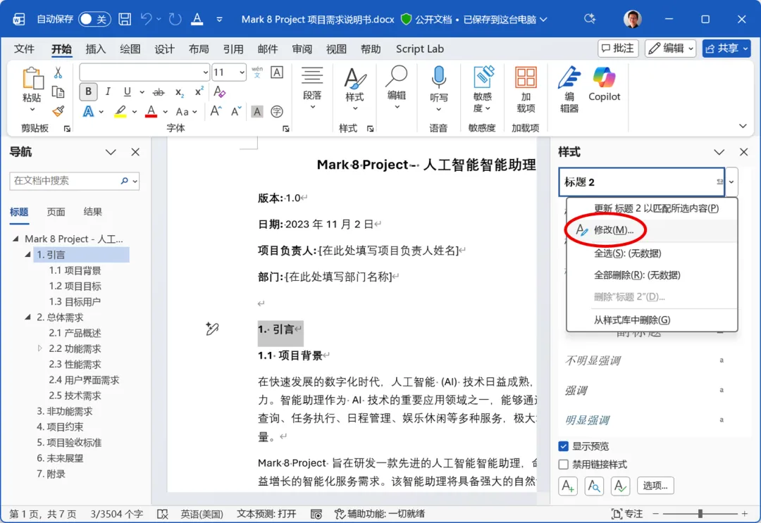 首先,在“样式”窗格中,找到相应的章节标题样式,展开其下拉菜单,并执行【修改】命令。