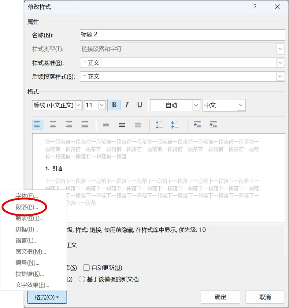 在“修改样式”对话框中,单击左下角的【格式】按钮,并执行【段落】命令。
