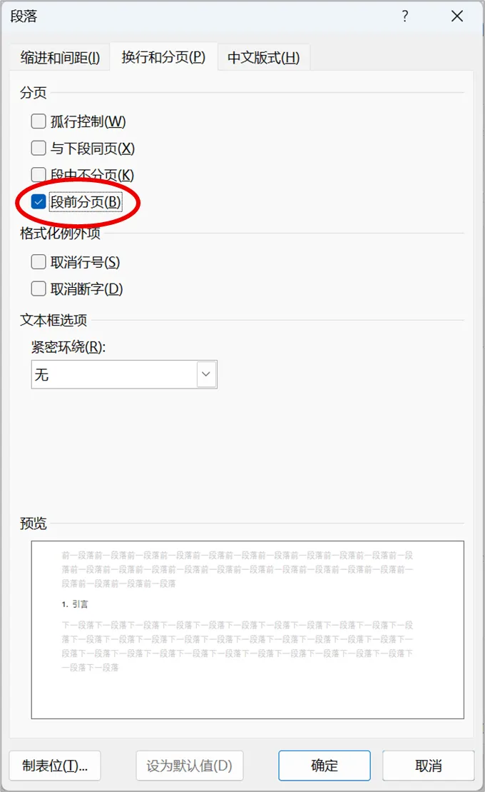 在“段落”对话框中,切换到“换行和分页”选项卡,选择“分页”区域中的“段前分页”复选框。