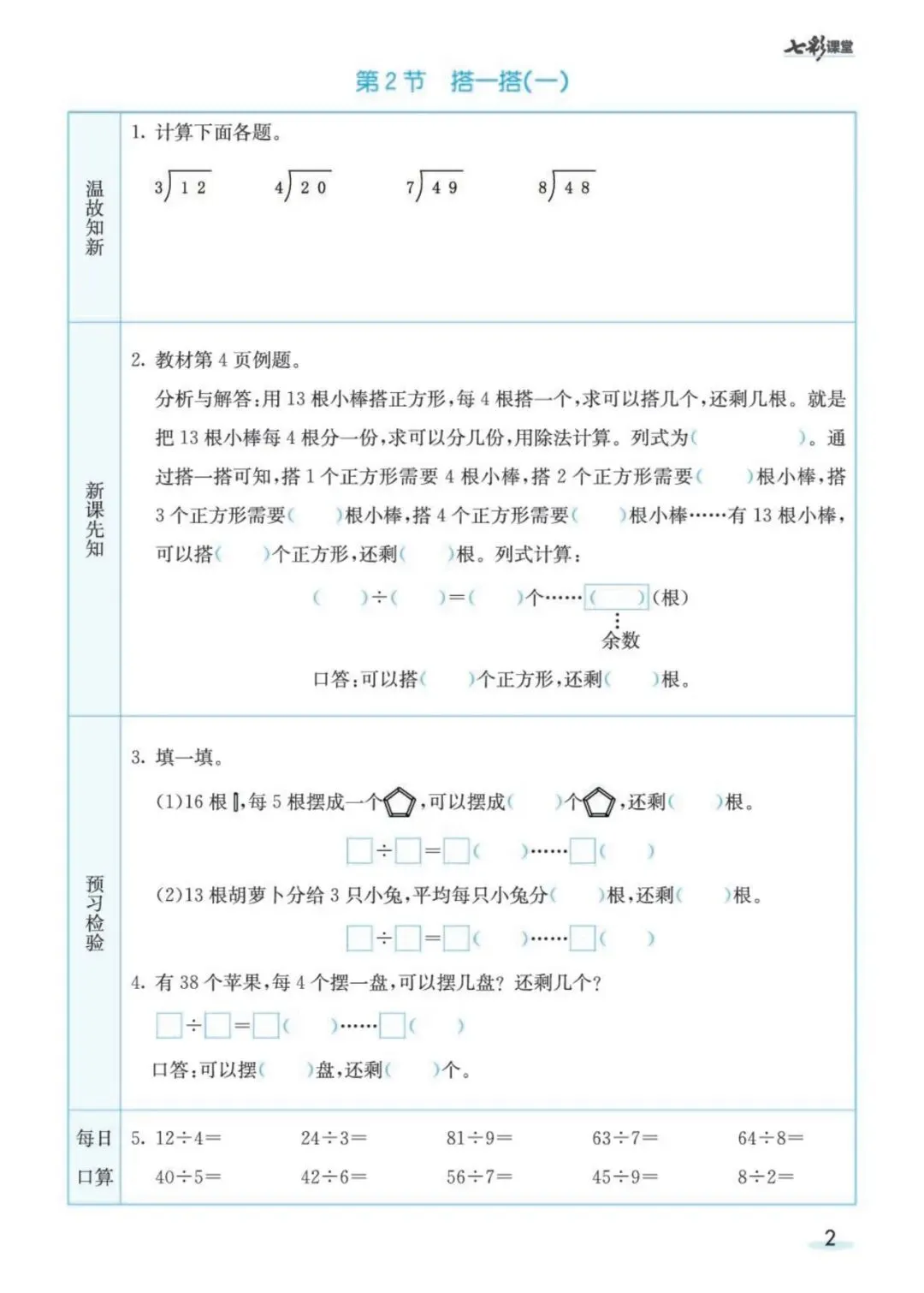 《北师大版数学2年级预习卡》可免费下载打印