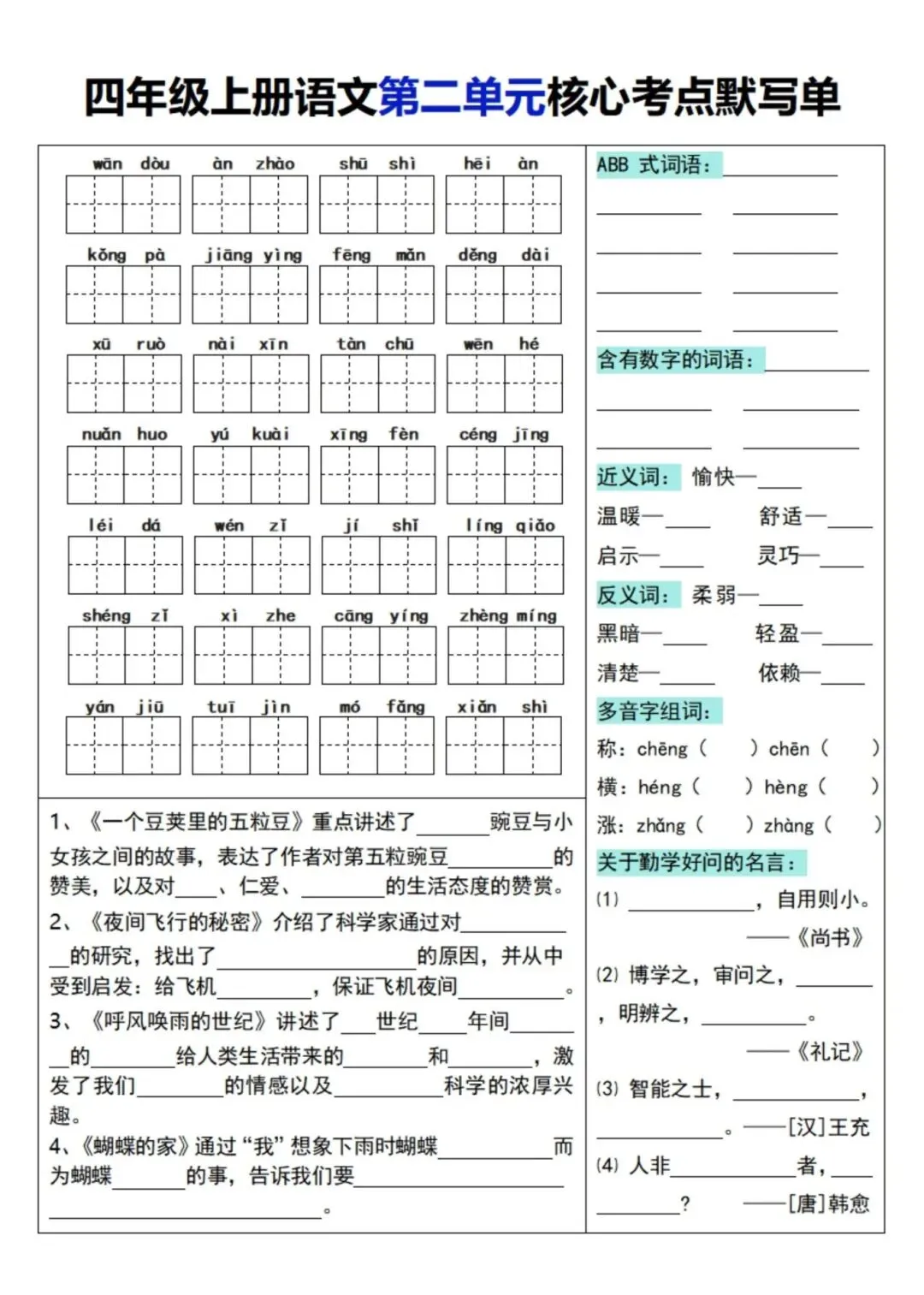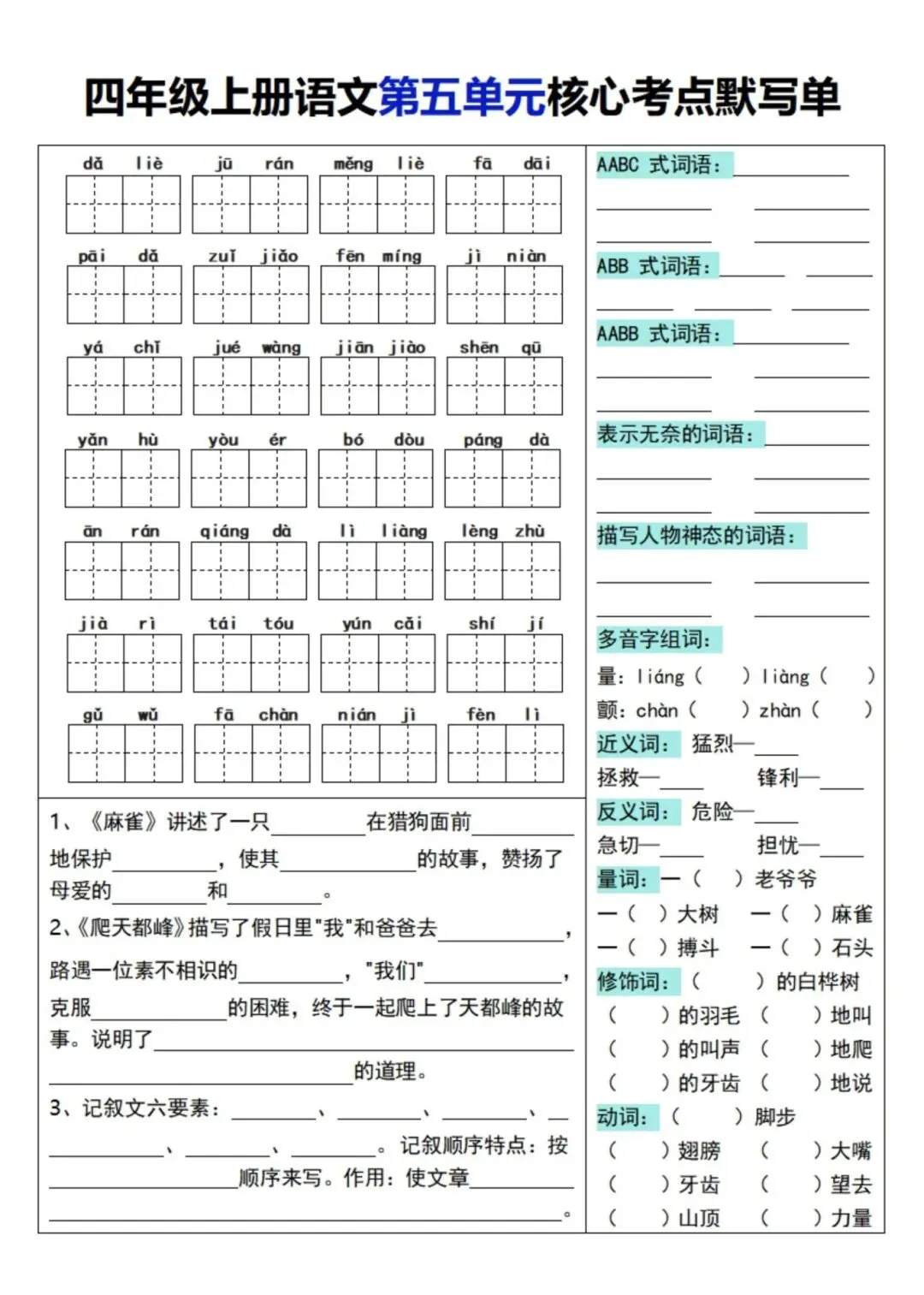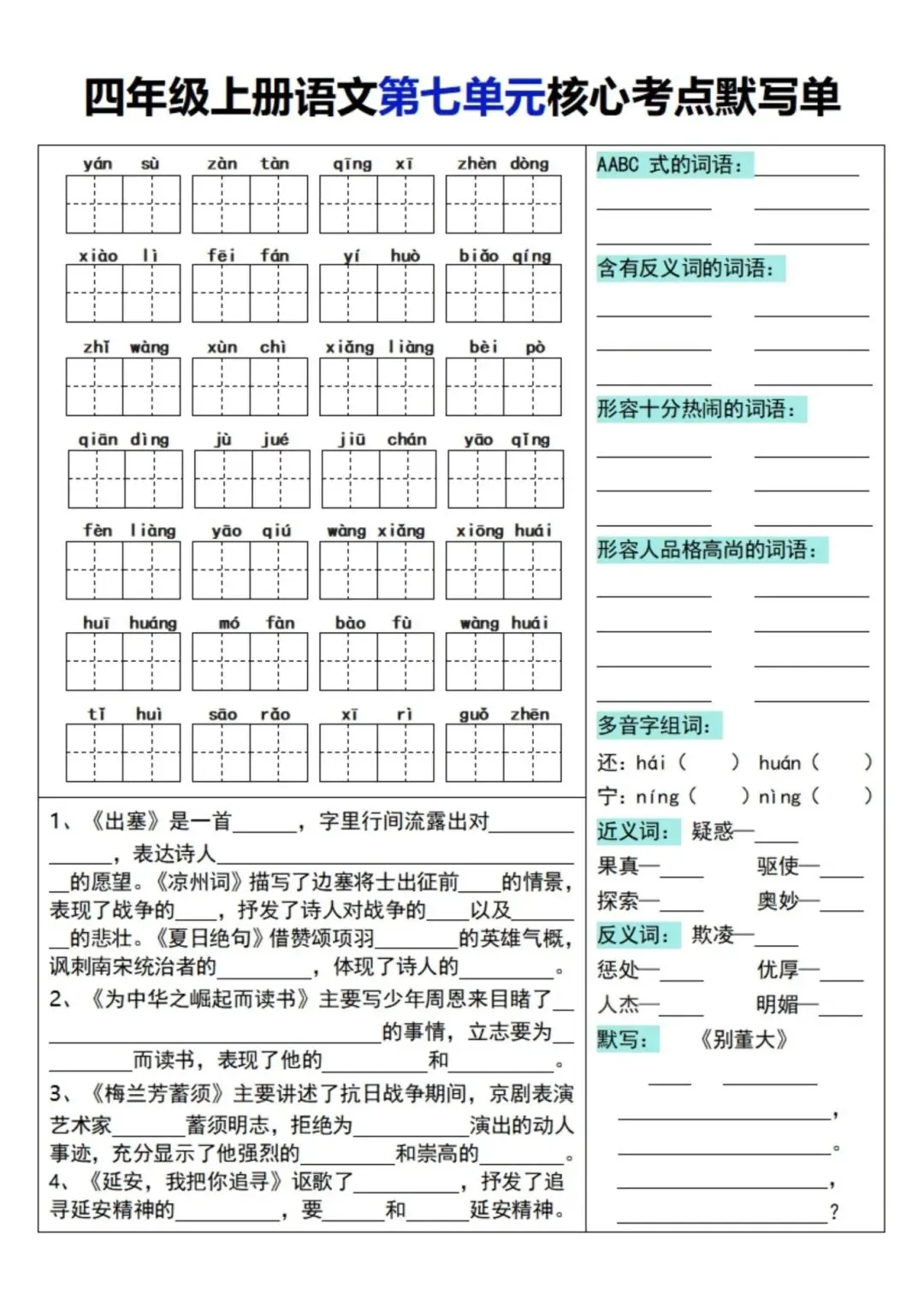 四年级上册语文单元核心考点默写单,电子版可下载打印