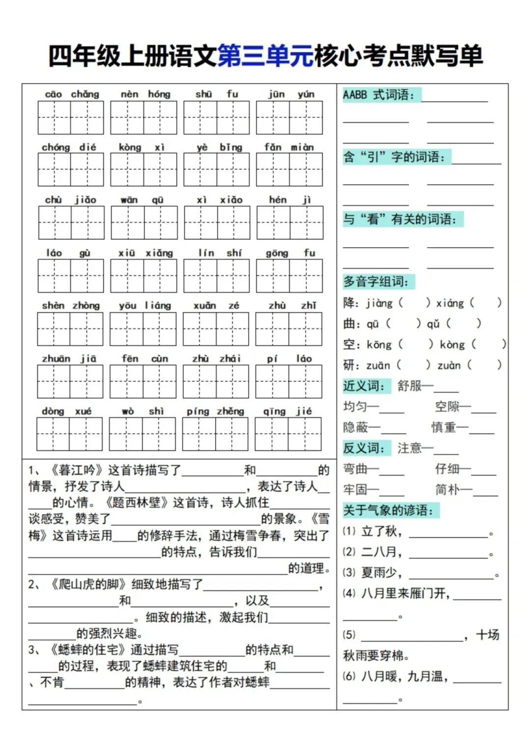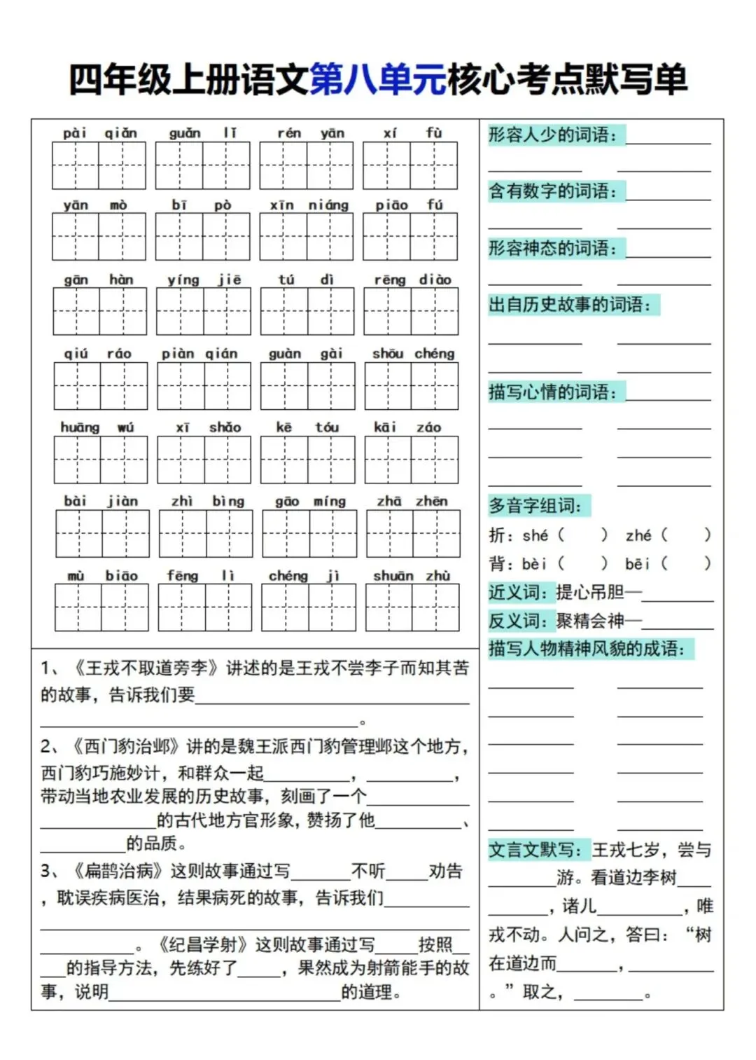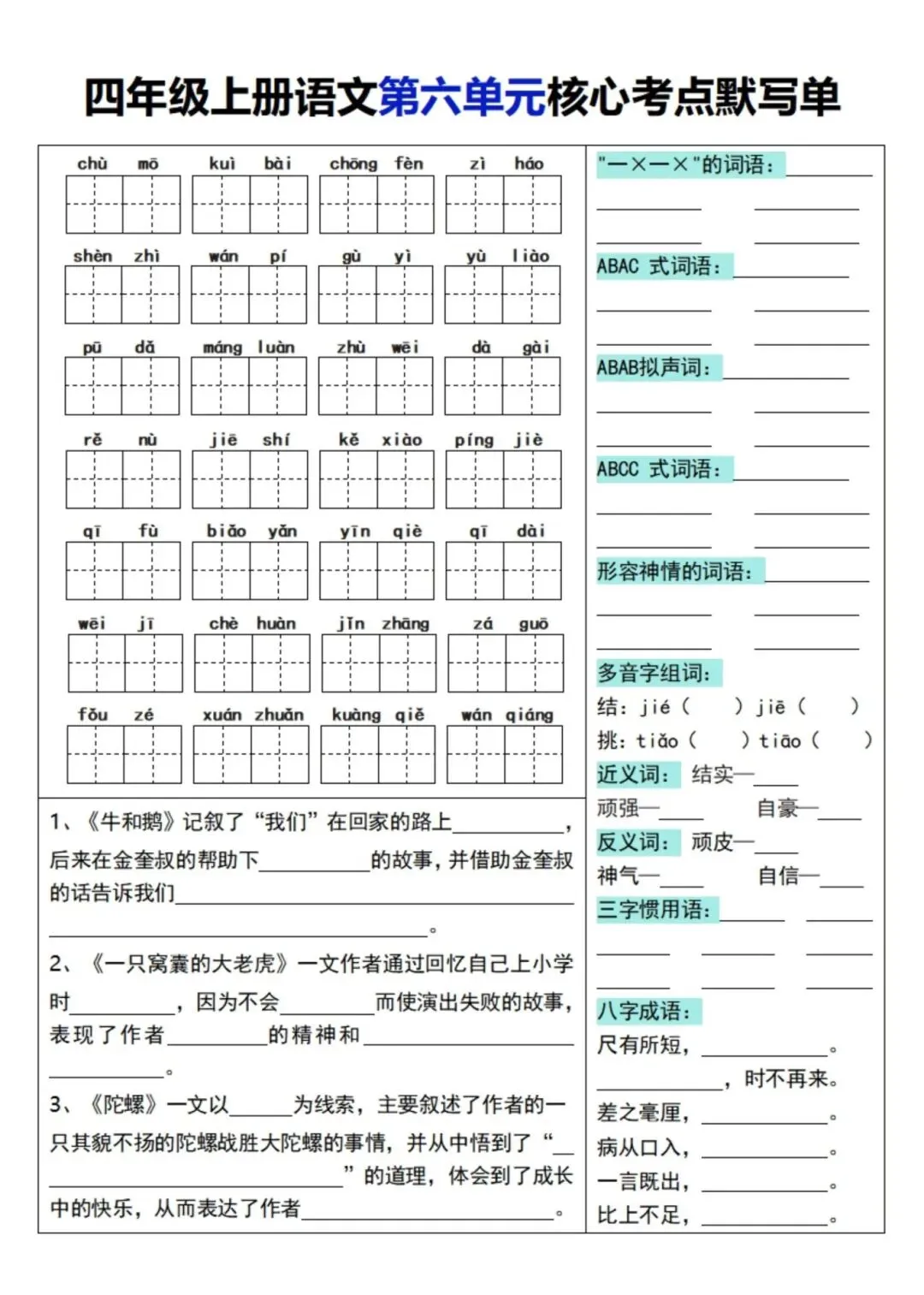 四年级上册语文单元核心考点默写单,电子版可下载打印