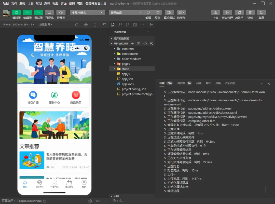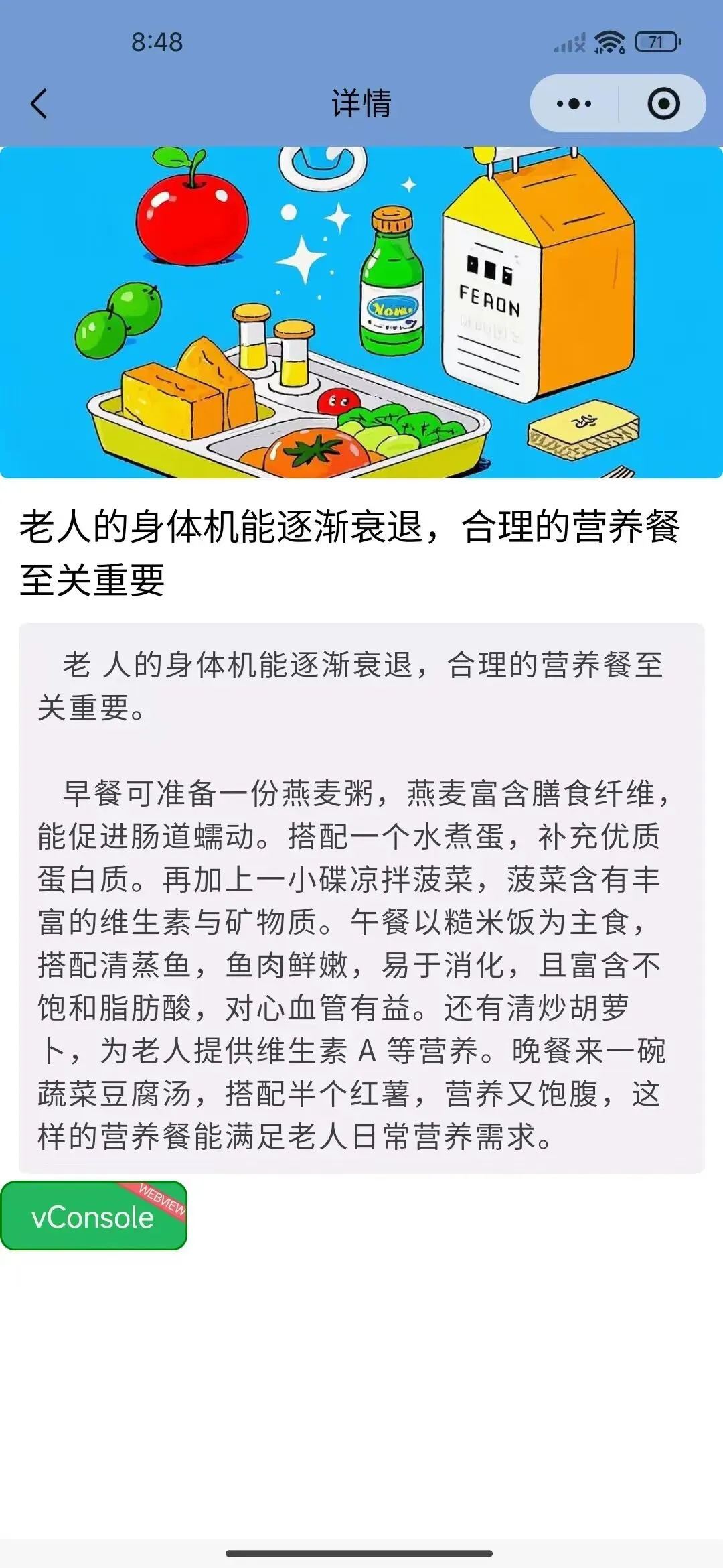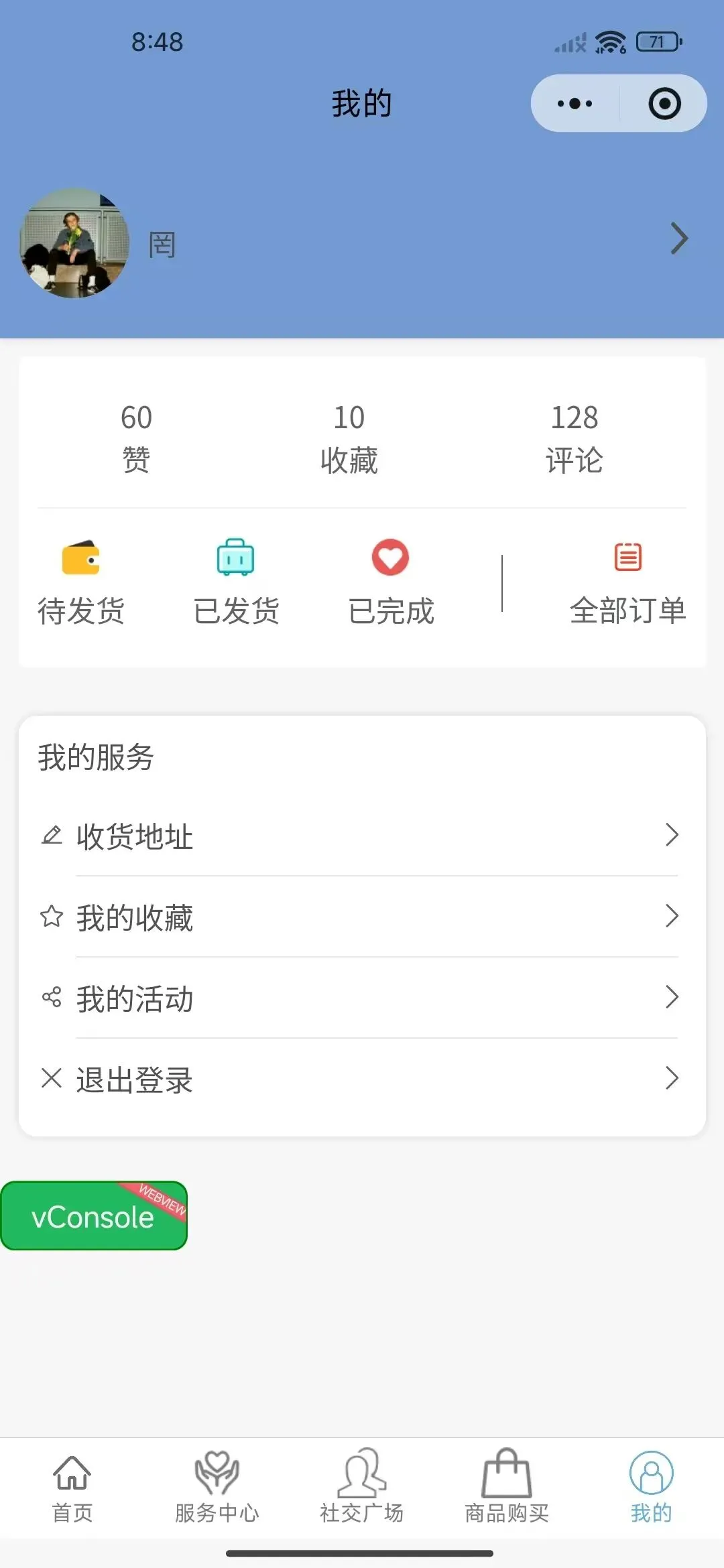 小程序端:服务预约(老年人的预约中心)、科普中心(老年视频科普、营养餐科普、安全出行科普)、社交广场(老年人可以发布自己的生活、并且可以相互点赞评论)、购物(在这里可以购买生活用品)、地址管理、收藏中心、活动预约、订单管理等。