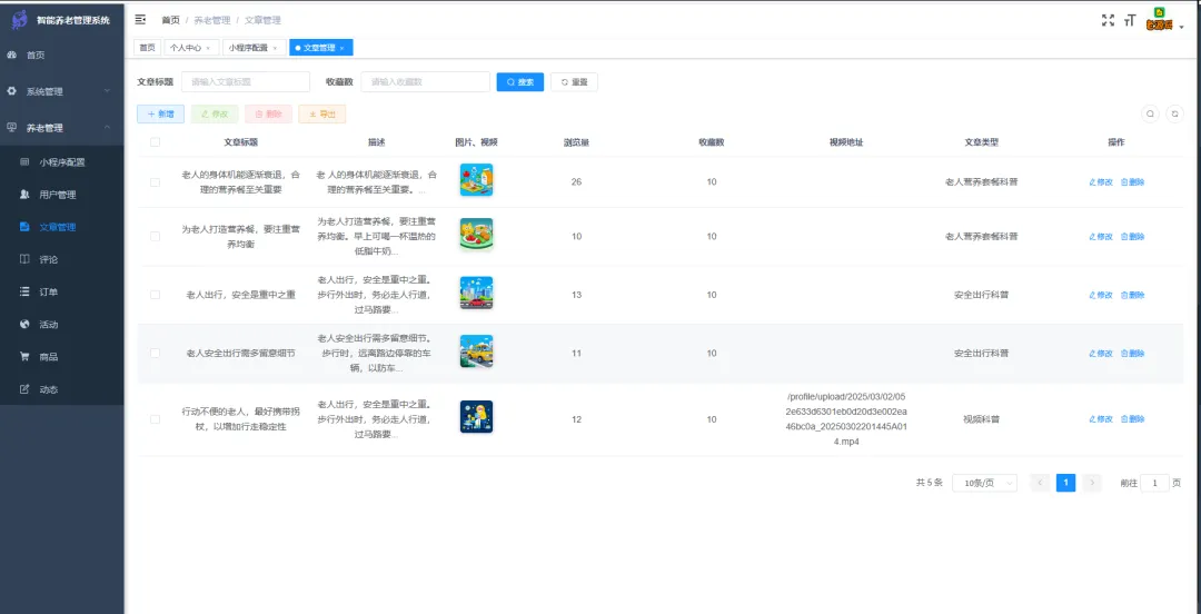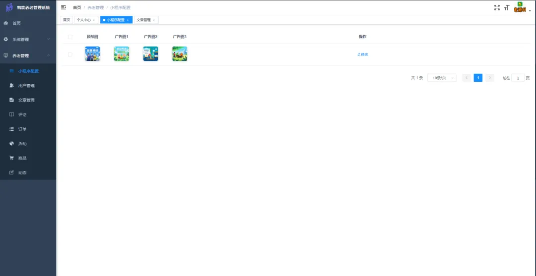 该系统为智慧养老小程序,分为管理端和用户端(小程序端)