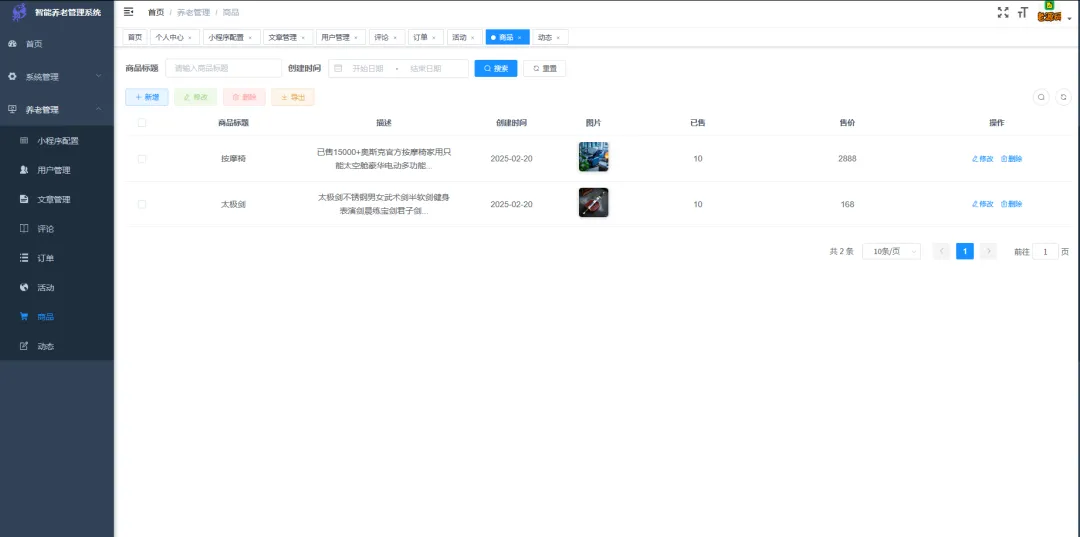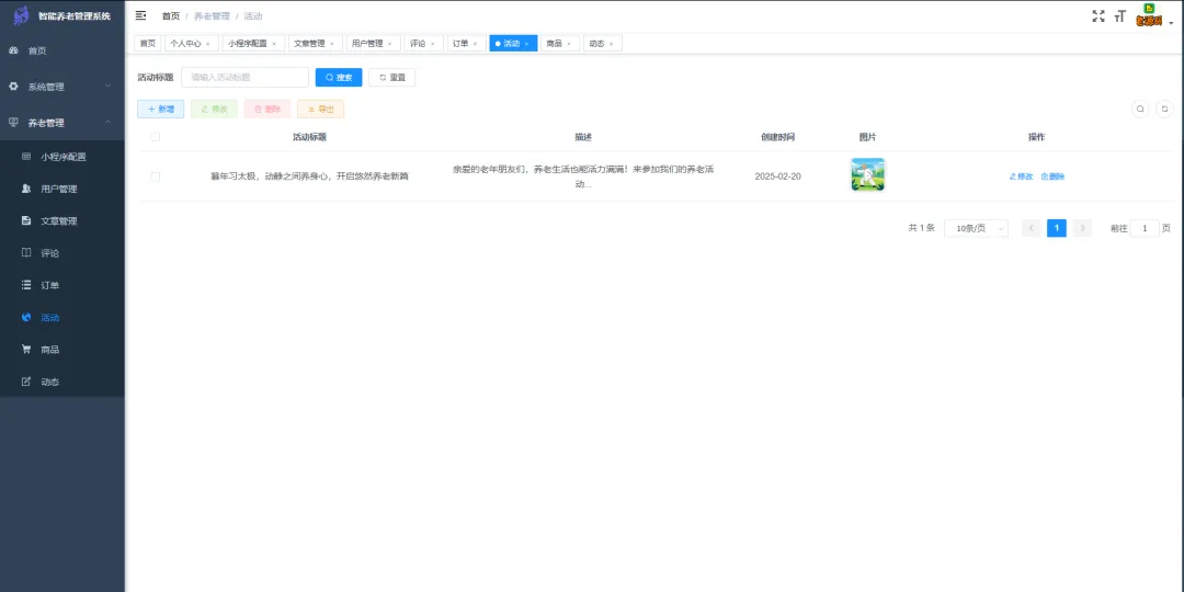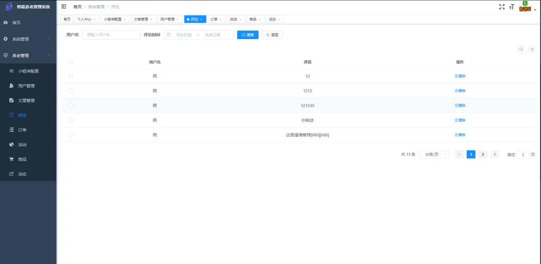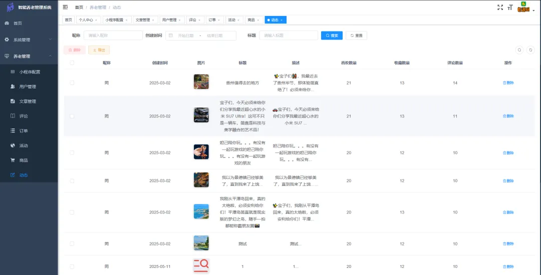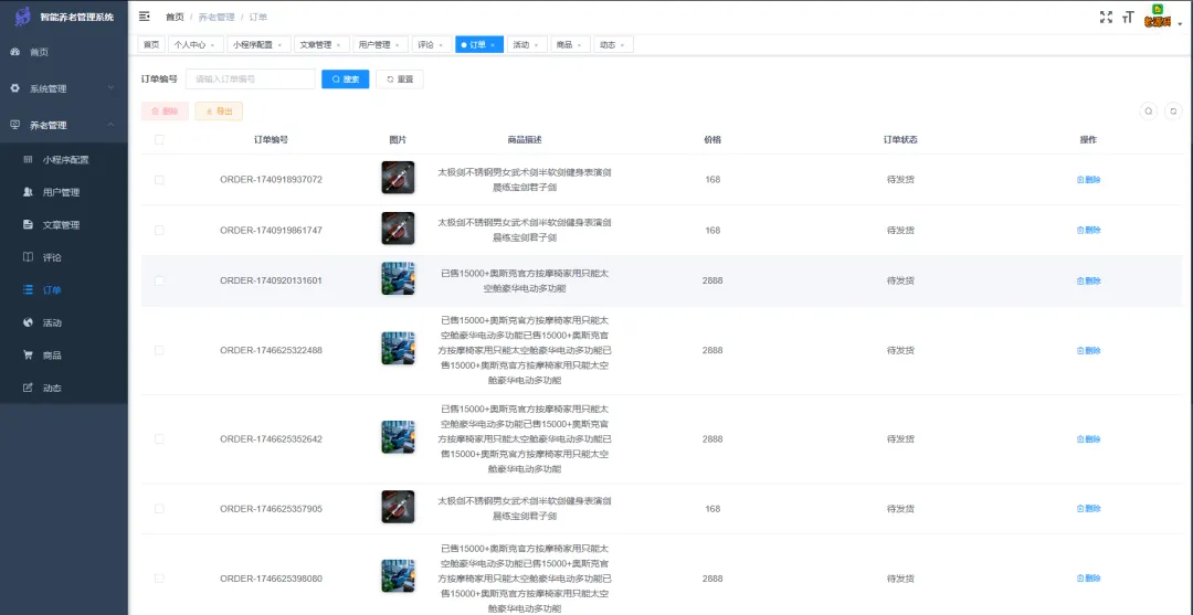 管理端:小程序管理、用户管理、文章管理、活动管理、评论管理、订单管理、活动管理、商品管理、动态管理