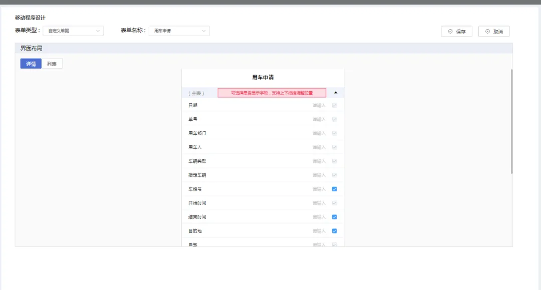 详情 为 APP端开单界面 配置, 灰色为必选项 蓝色部分为可选显示项目,手动拖动可改变顺序位置