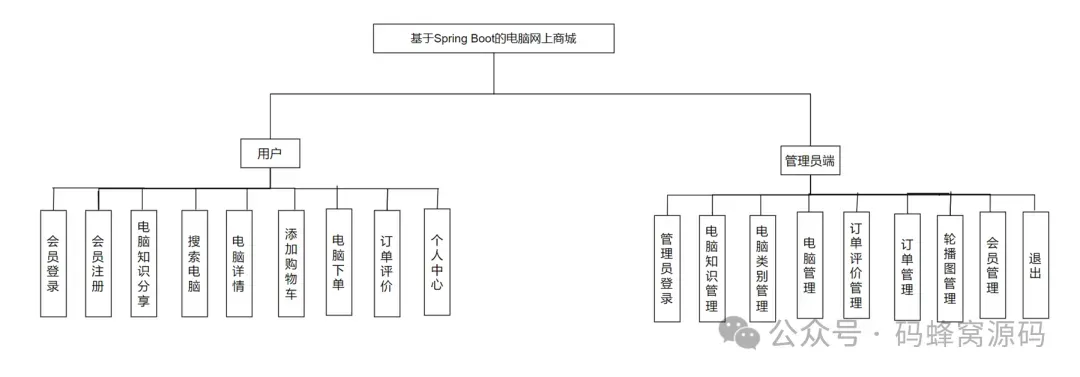 电脑商城管理系统包括登录、电脑知识管理、电脑类别管理、电脑管理、订单评价管理、 订单管理、轮播图管理、会员管理、订单管理的功能模块设计如图 :