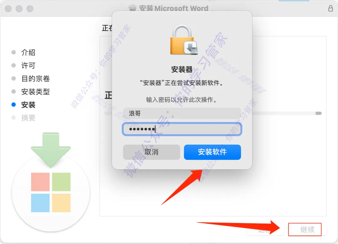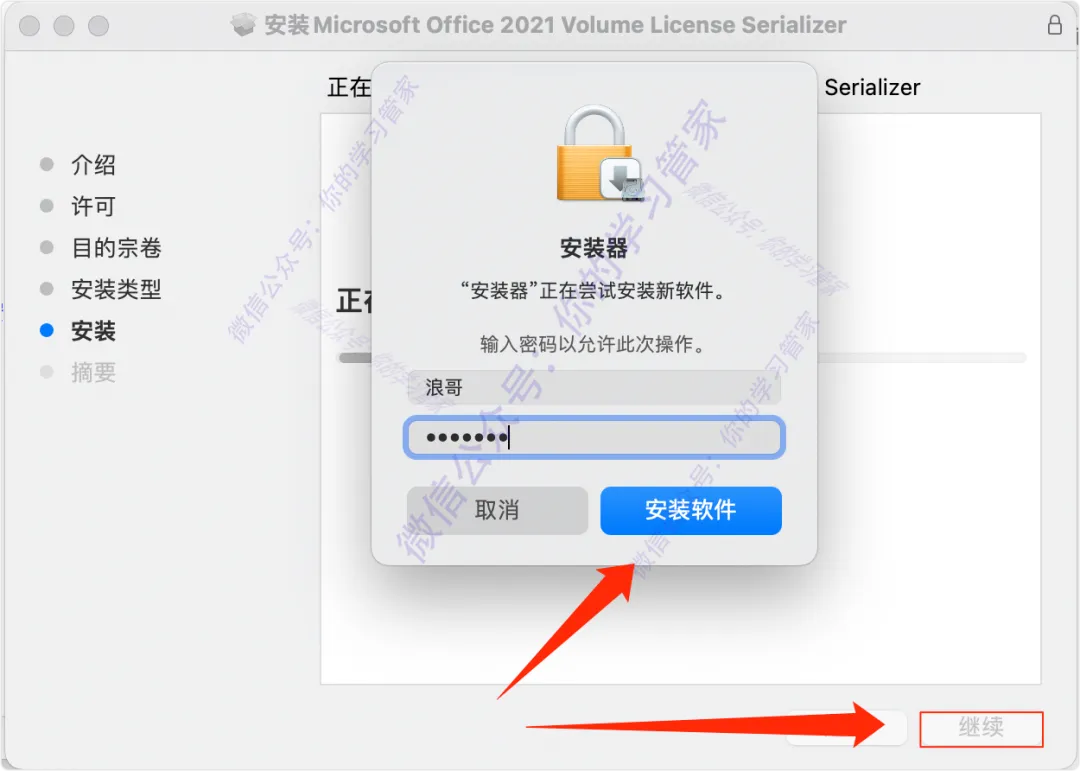 13、然后点击【继续】,输入你的电脑登录密码,然后点击【开始安装】;