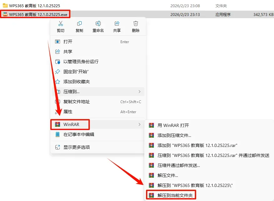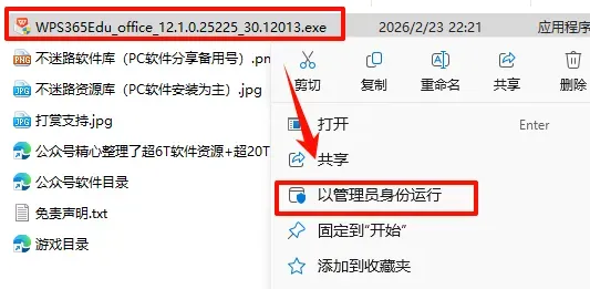 2.打开刚刚解压的文件夹,鼠标右键点击“WPS365Edu_office_12.1.0.25225_30.12013.exe”选择“以管理员身份运行”