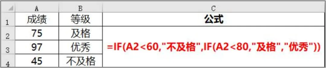 定义:根据逻辑判断是或否,返回两种不同的结果。书写规则:=if(逻辑判断语句,逻辑判断”是”返回的结果,逻辑判断”否”返回的结果)。题目要求:成绩<60显示不及格,成绩在60-80间显示及格,成绩>80显示优秀。
