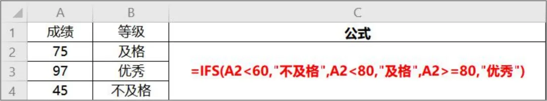 定义:检查是否满足一个或多个条件,且返回符合第一个true条件的值,ifs函数可以取代多个嵌套if函数书写规则:=ifs(逻辑判断语句1,逻辑判断语句1″是”返回的结果,逻辑判断语句2,逻辑判断语句2″是”返回的结果)。题目要求:成绩<60显示不及格,成绩在60-80间显示及格,成绩>=80显示优秀。