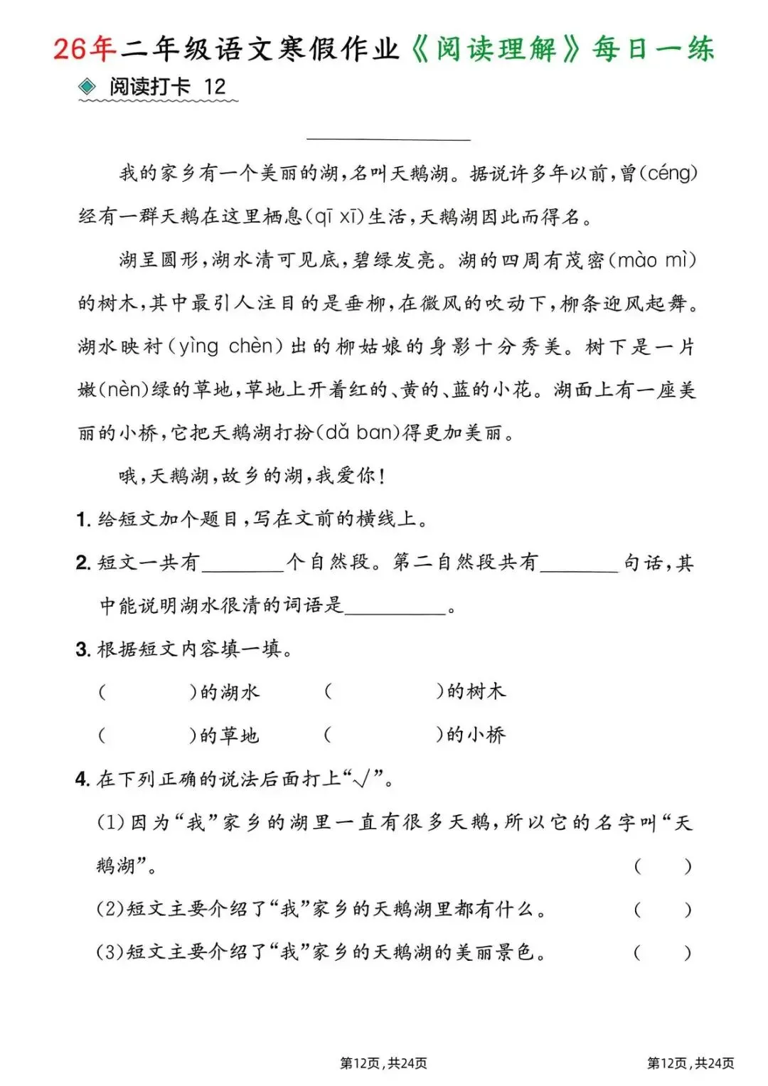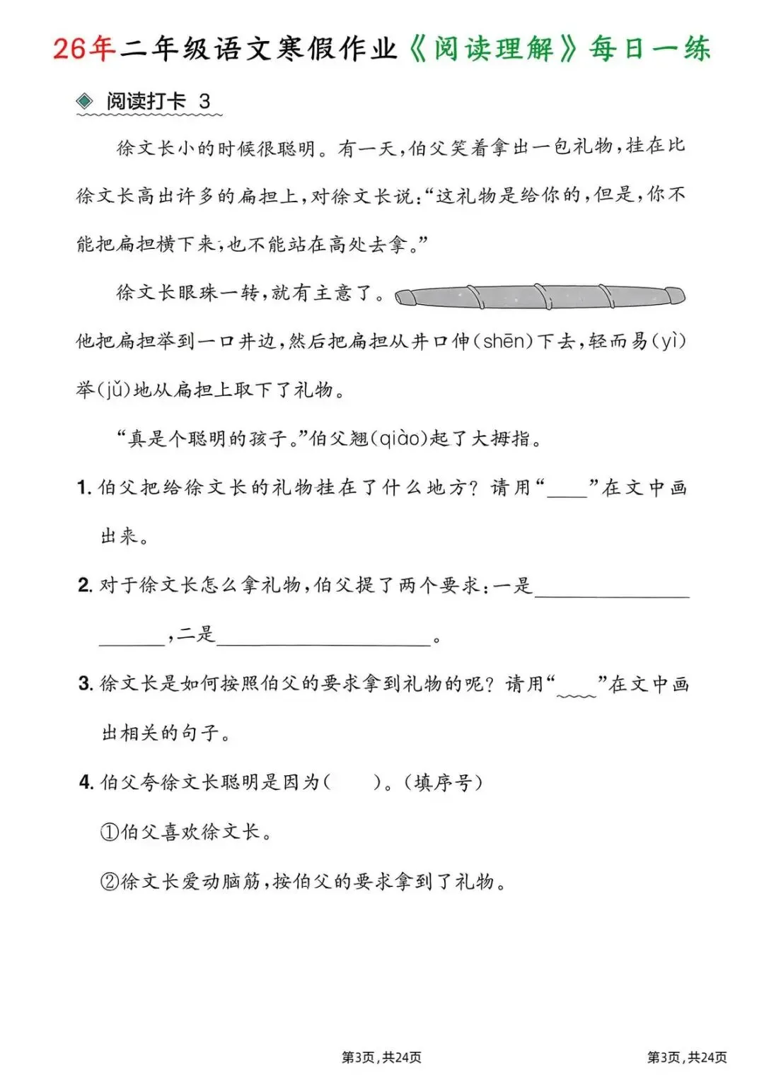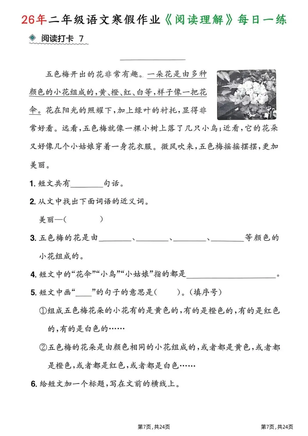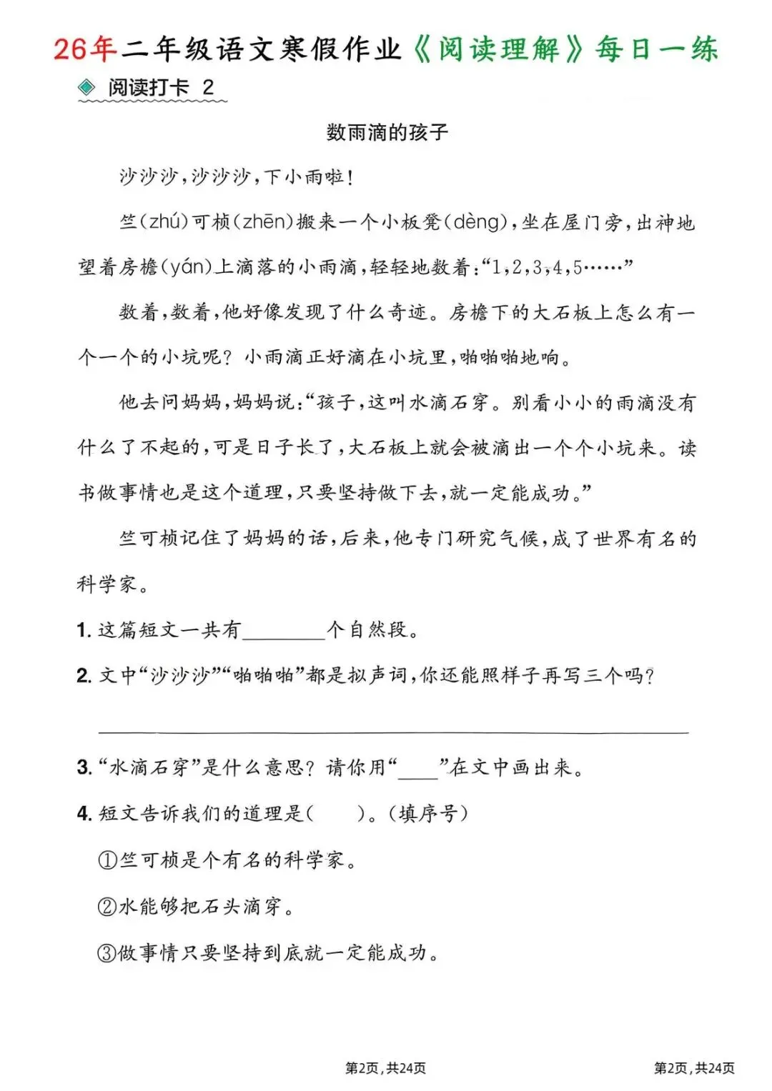26春二年级下册语文|1份电子版《寒假作业阅读理解每日一练》,24页每日一练搞定阅读难题!