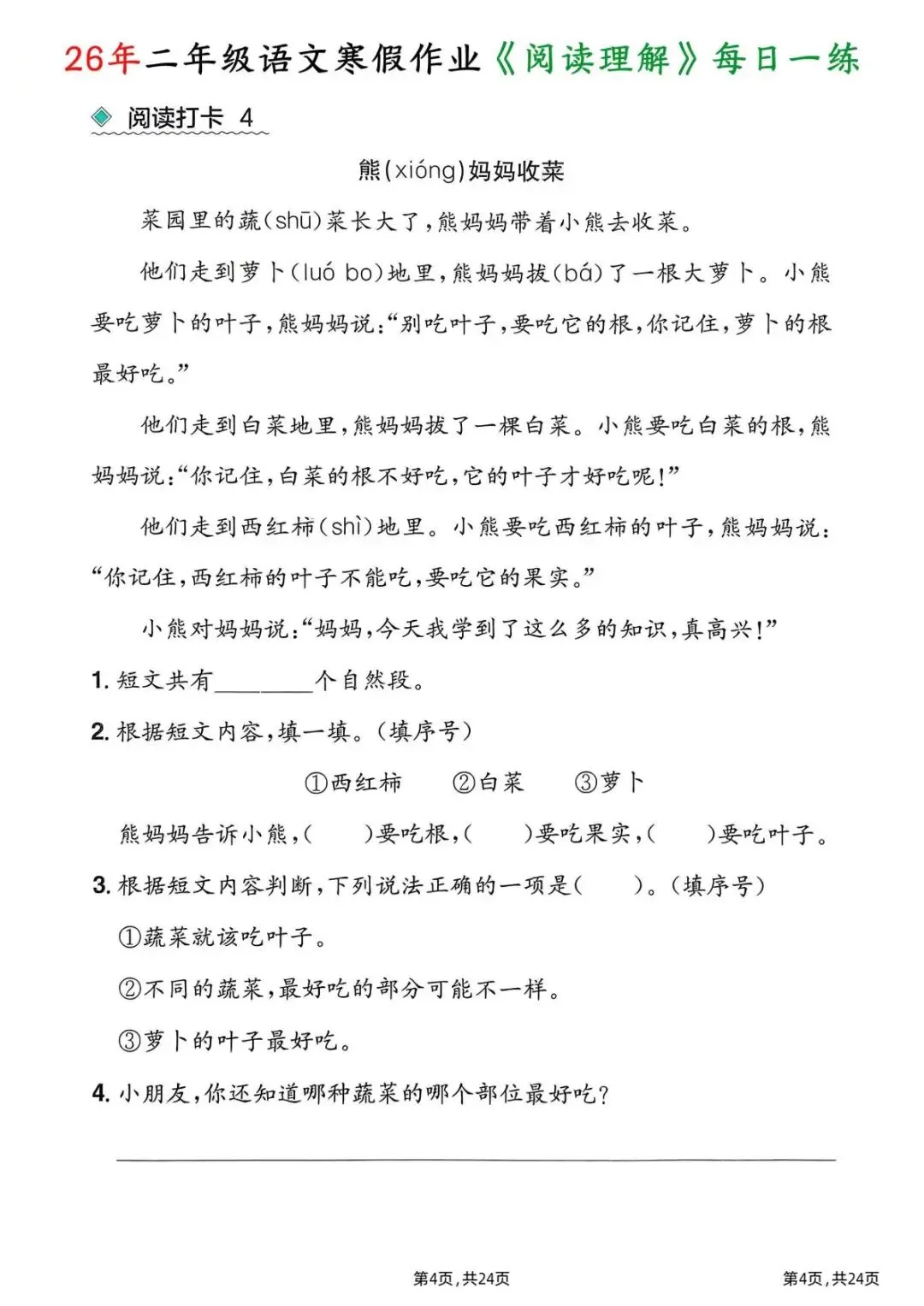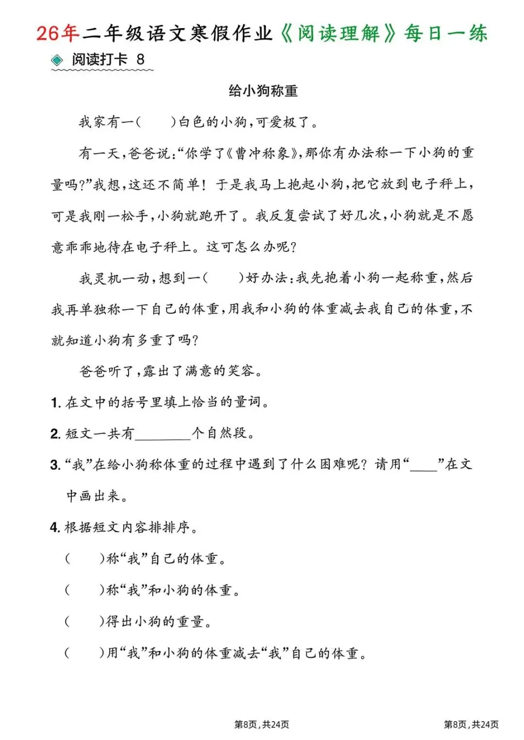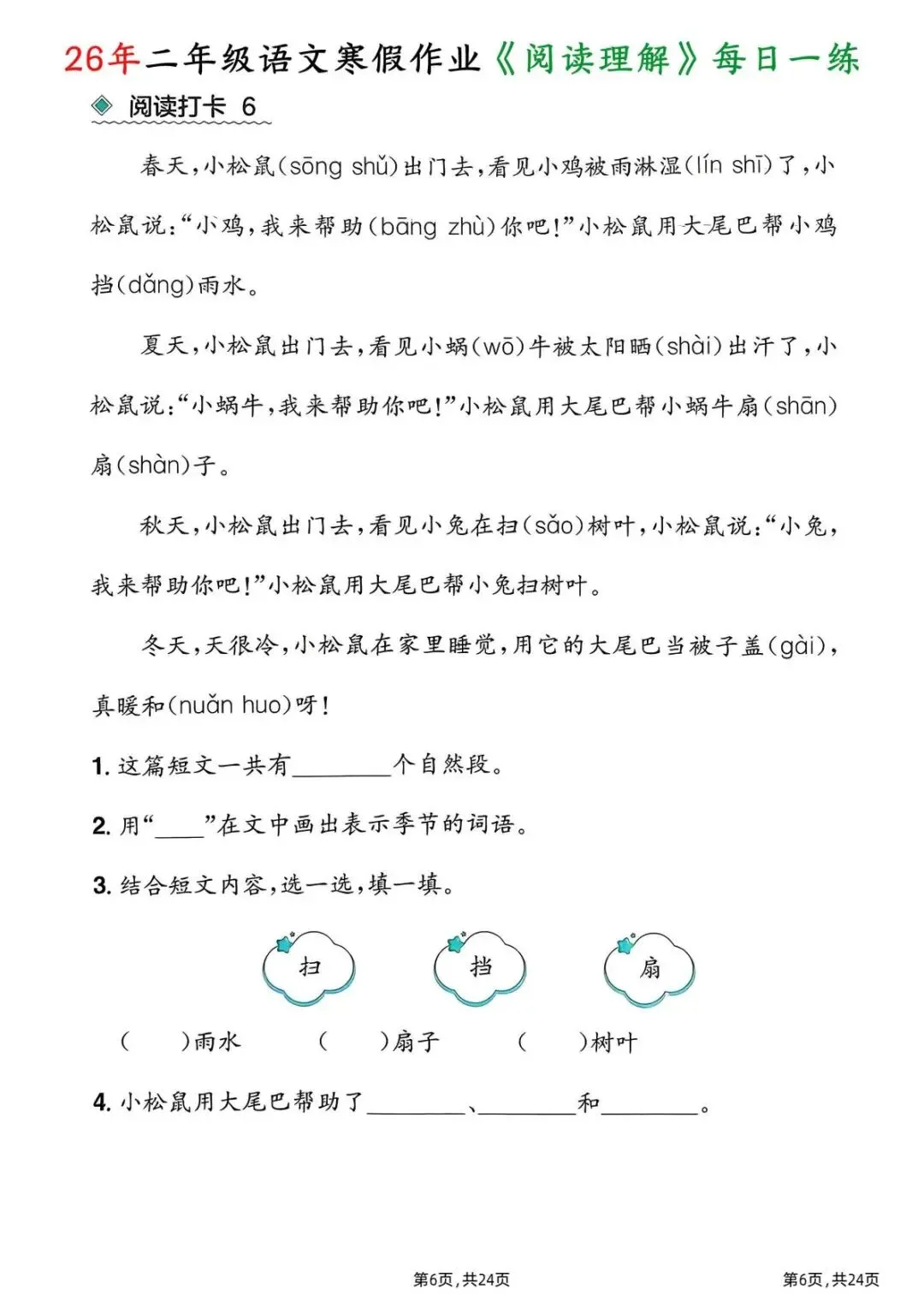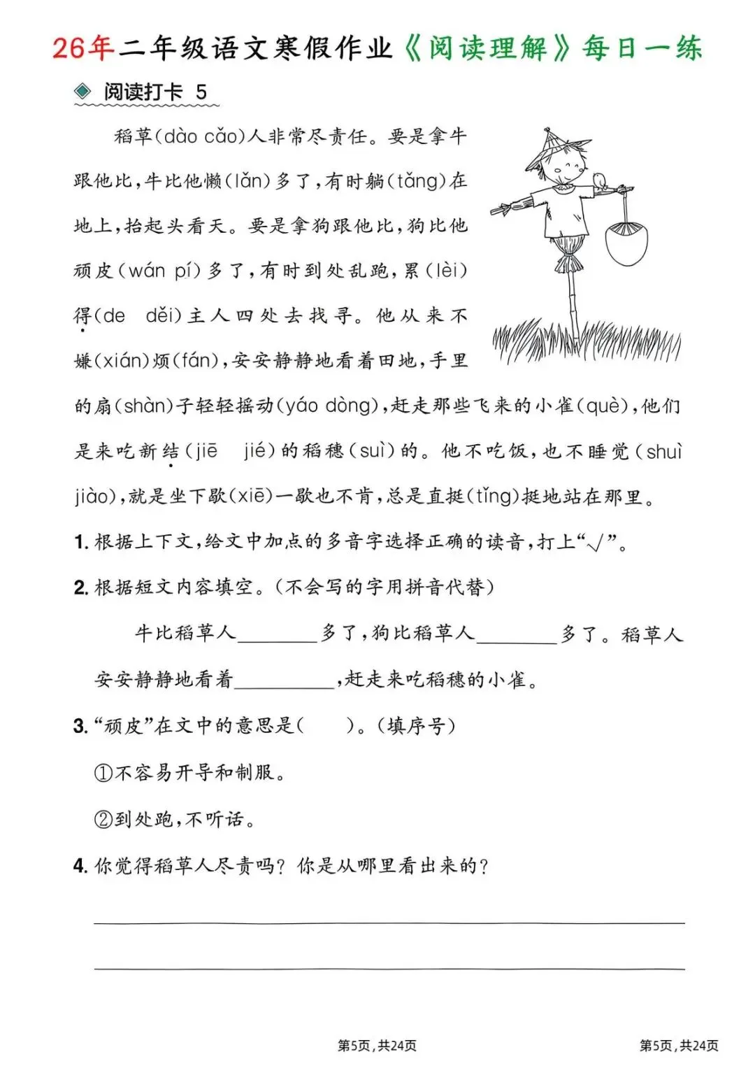 26春二年级下册语文|1份电子版《寒假作业阅读理解每日一练》,24页每日一练搞定阅读难题!