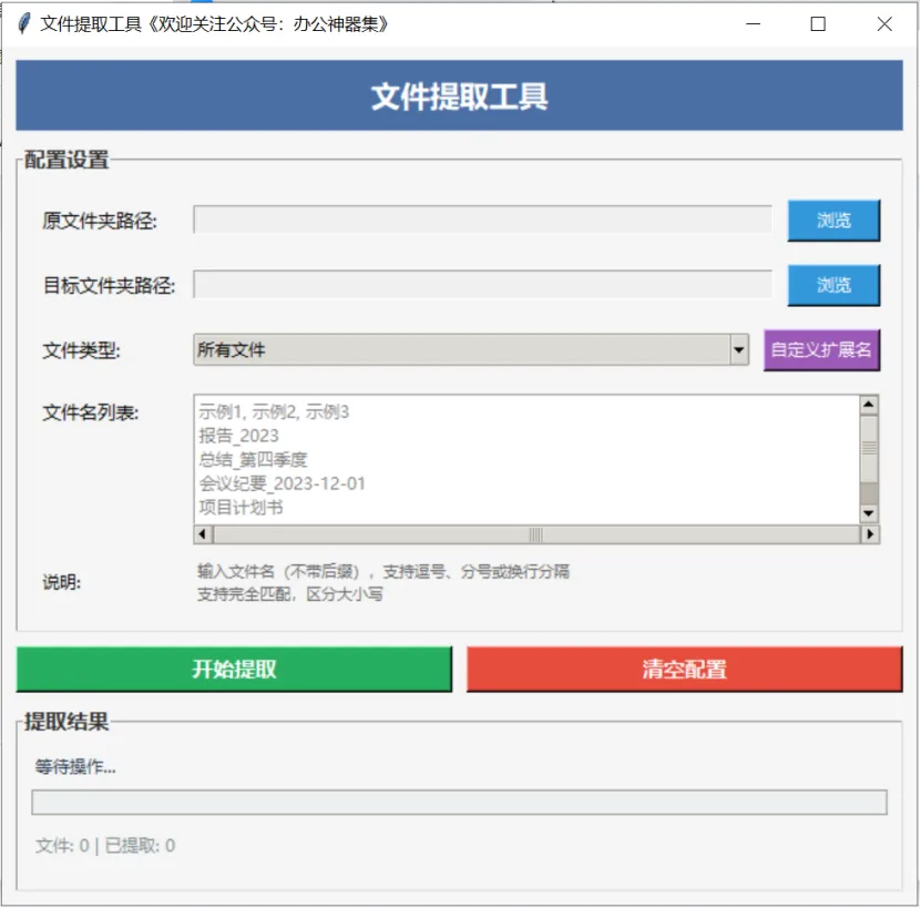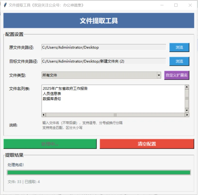 操作便捷:选择文件夹路径,点击按钮即可批量提取文件。