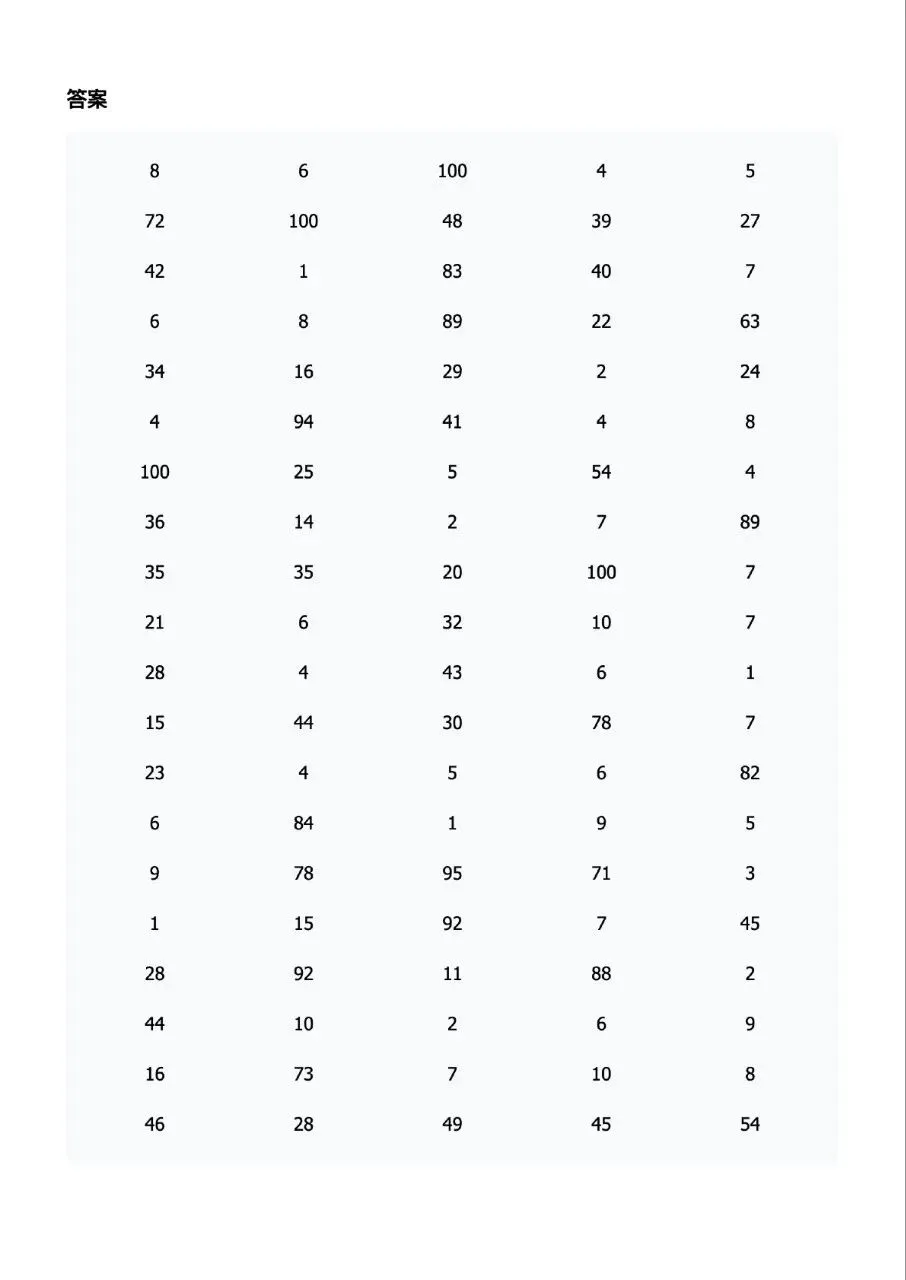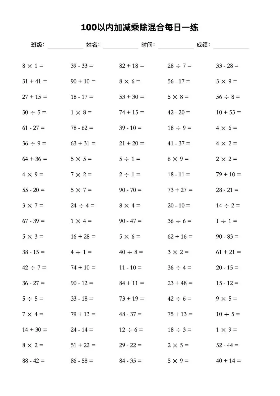 100以内的加减乘除混合口算题卡每日一练可打印电子版带答案