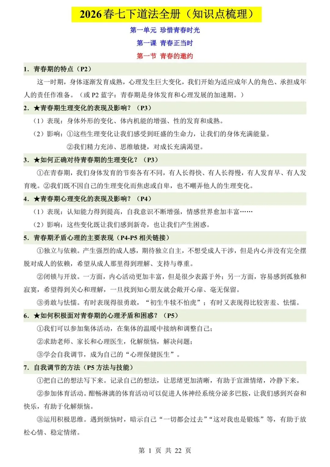 这是一套专为七年级下册道德与法治打造的全册知识点梳理资料,精准对标2026年春季学期教学大纲,是学生预习、复习、备考的“提分神器”。