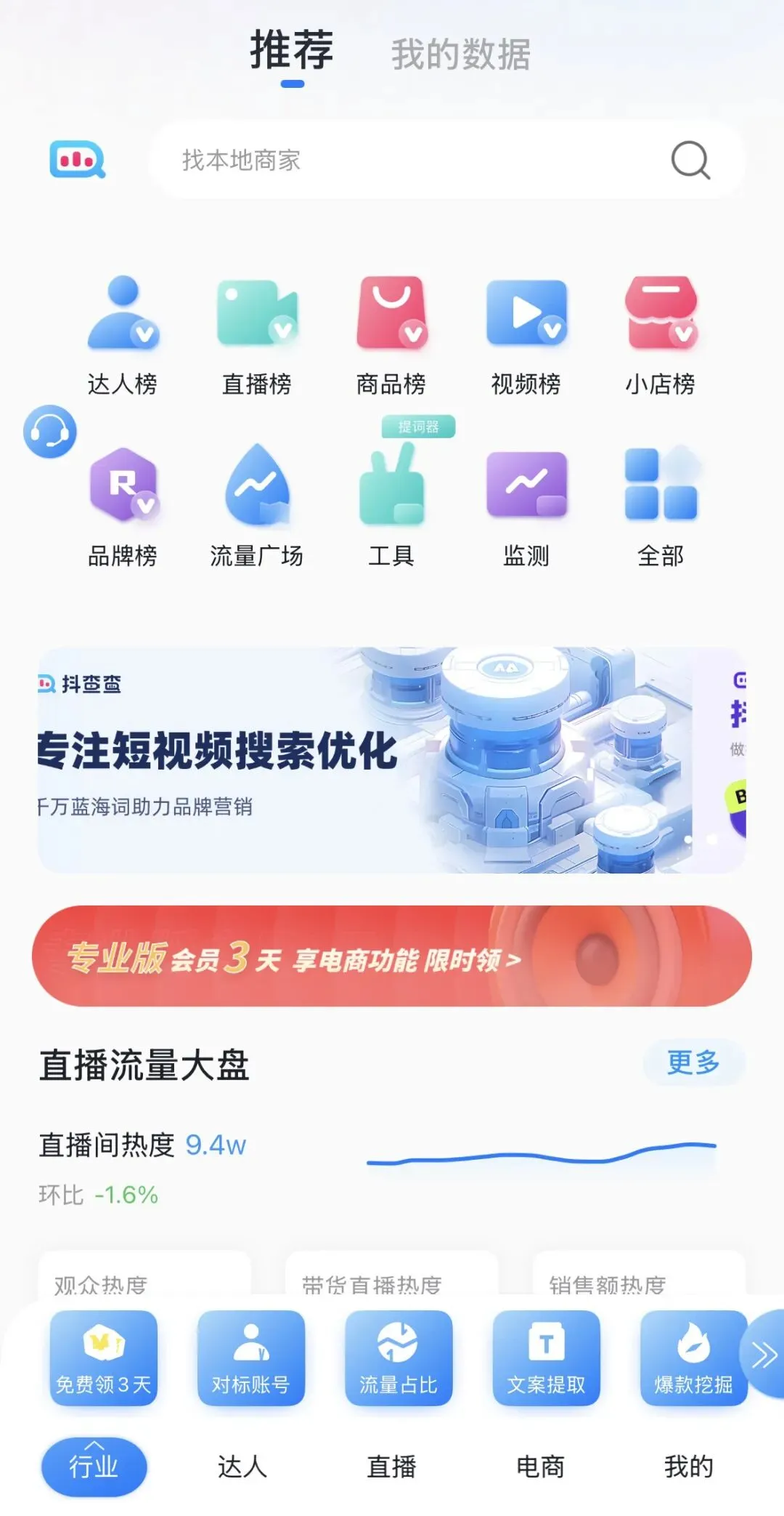 这款APP就是抖查查。这款APP是抖音生态的中立数据助手,定位是把分散的公开信息结构化、可视化,降低运营的信息差与时间成本。它适合直播操盘手、短视频创作者、电商商家、MCN机构、投放优化师使用,核心价值是用数据替代直觉,提升决策效率与成功率。它不提供代运营、不保证涨粉变现,仅以工具属性提供数据支持,客观中立是其长期立足的基础。