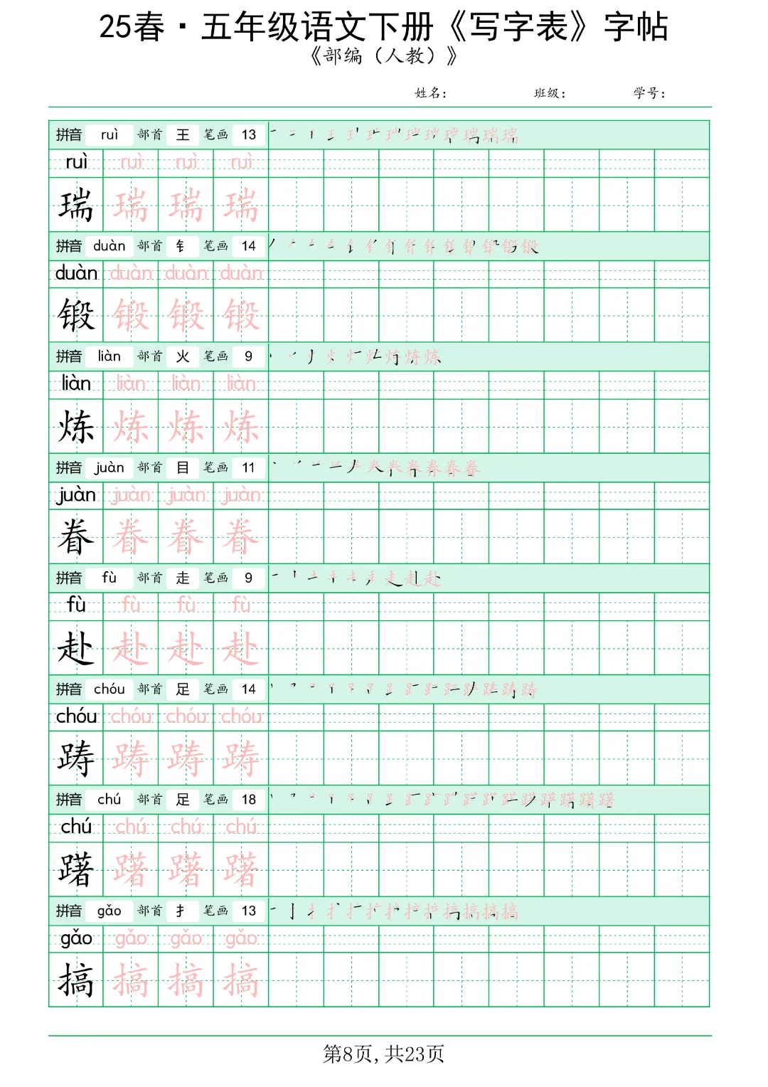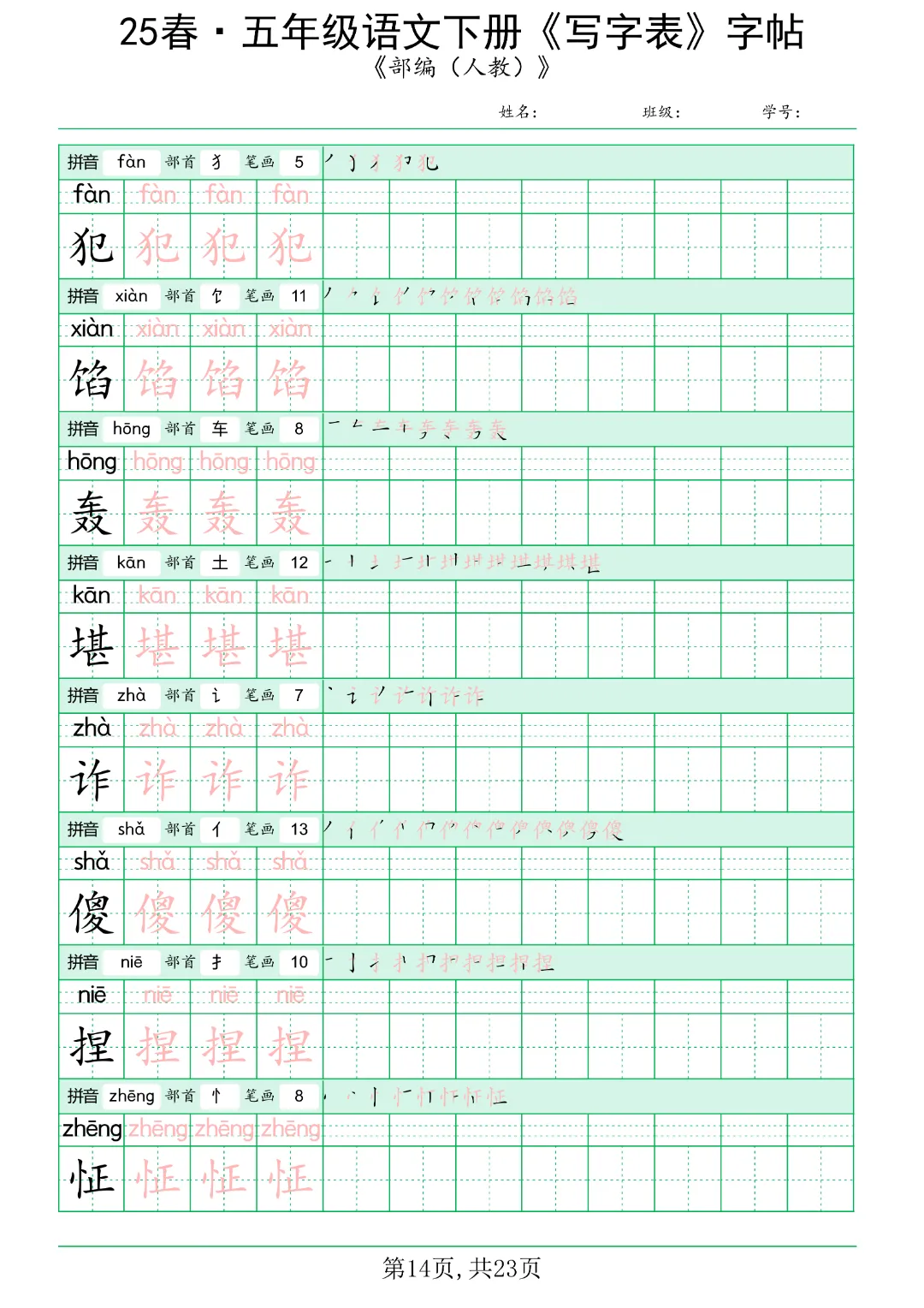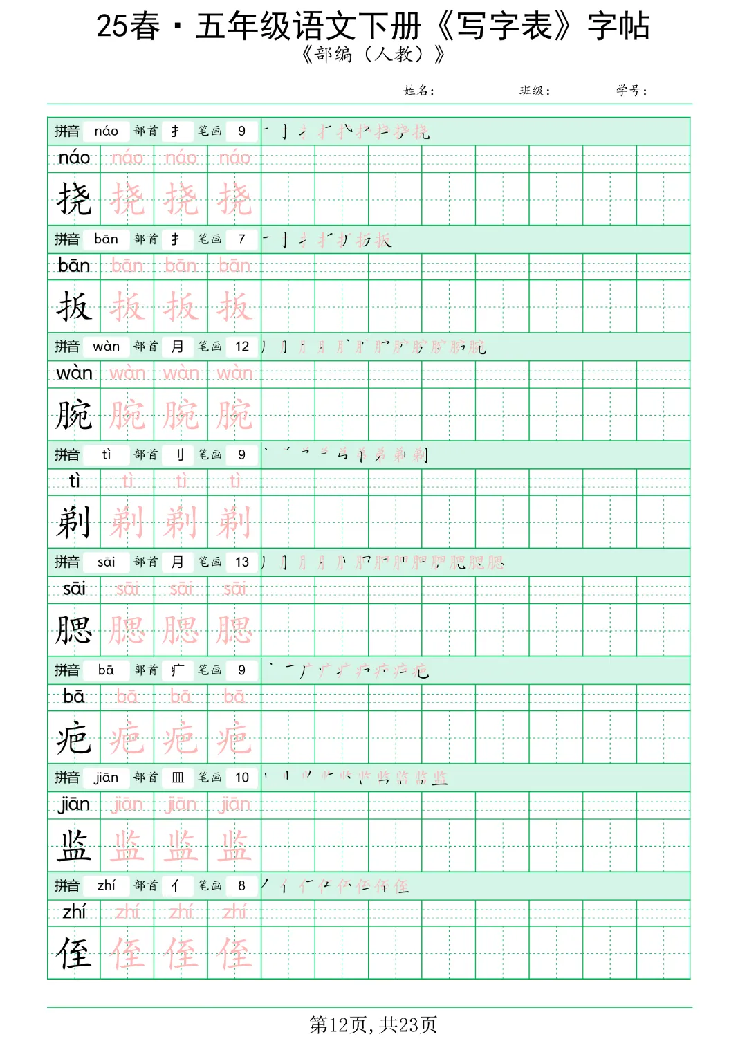 - 攻克高频考点:五年级下册的写字表通常包含约180-220个要求会写的字。这些字是单元检测和期末考试中“看拼音写词语”、“按要求填空”等基础题型的核心。通过字帖练习,孩子能精准掌握这些字的音、形、义,并熟悉其多音字、形近字的辨析,直接拿下试卷中40%-50%的基础分。