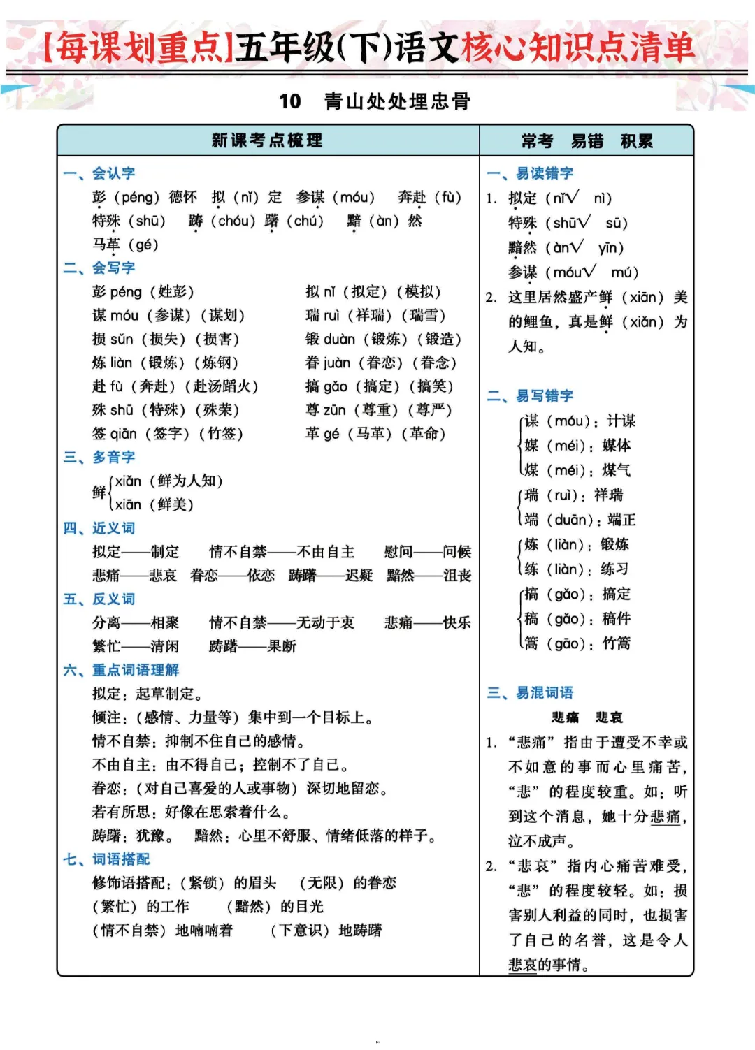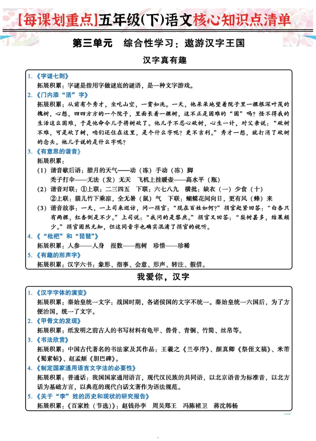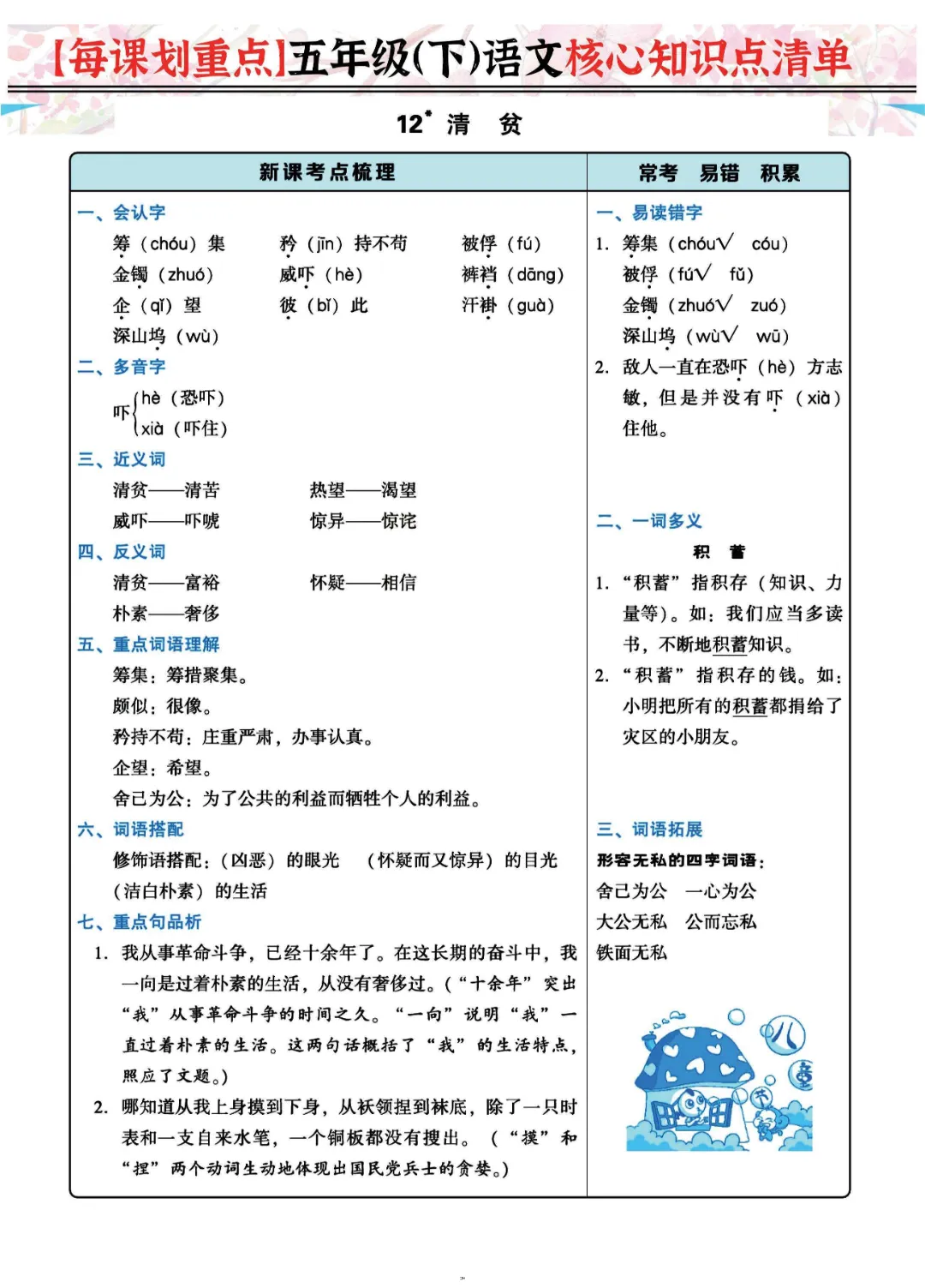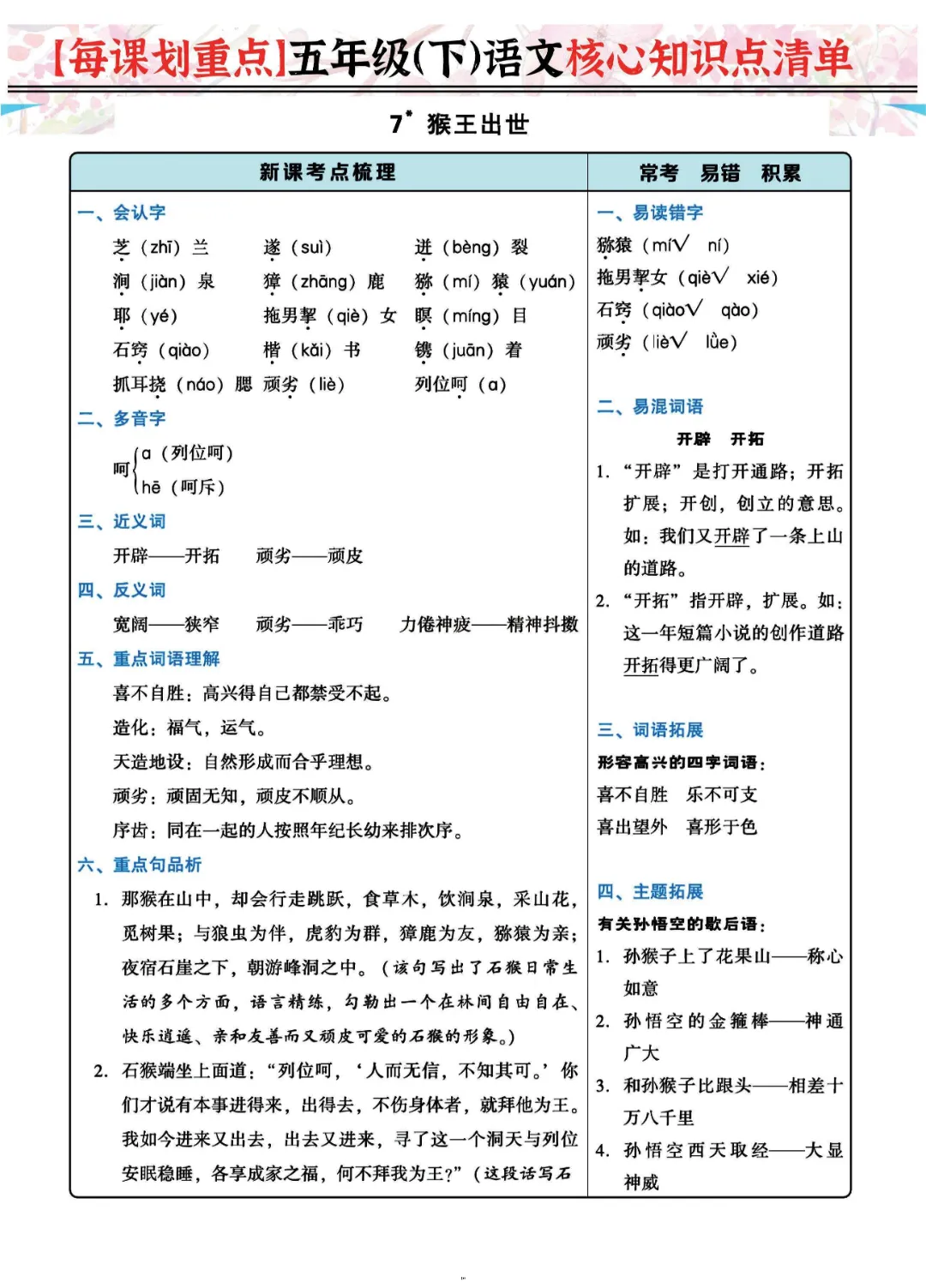 五年级下册语文每课核心知识点清单(电子版可打印)
