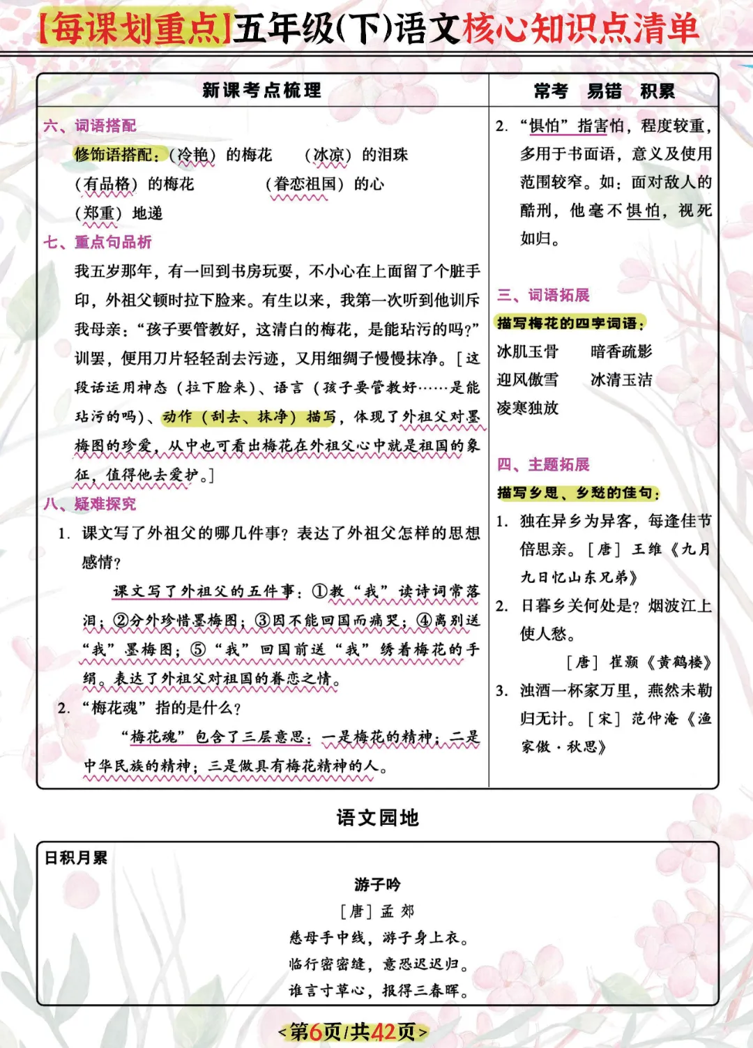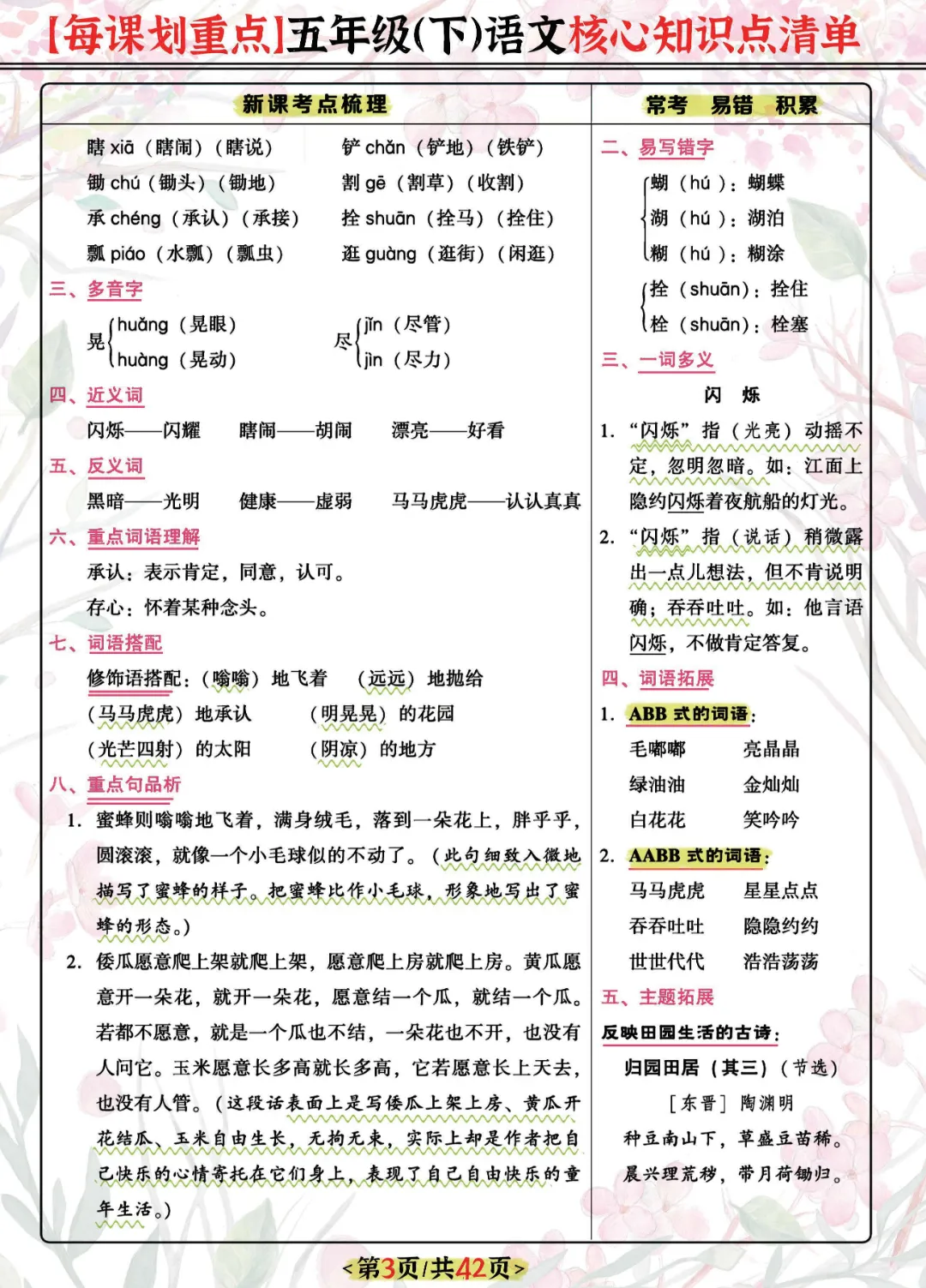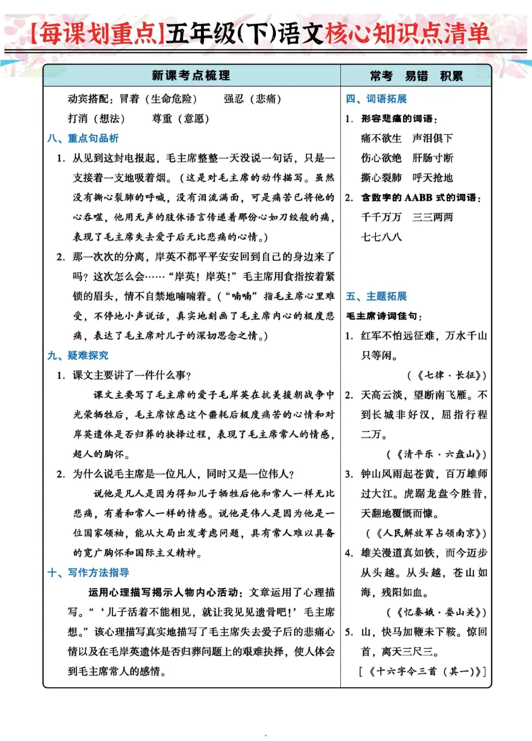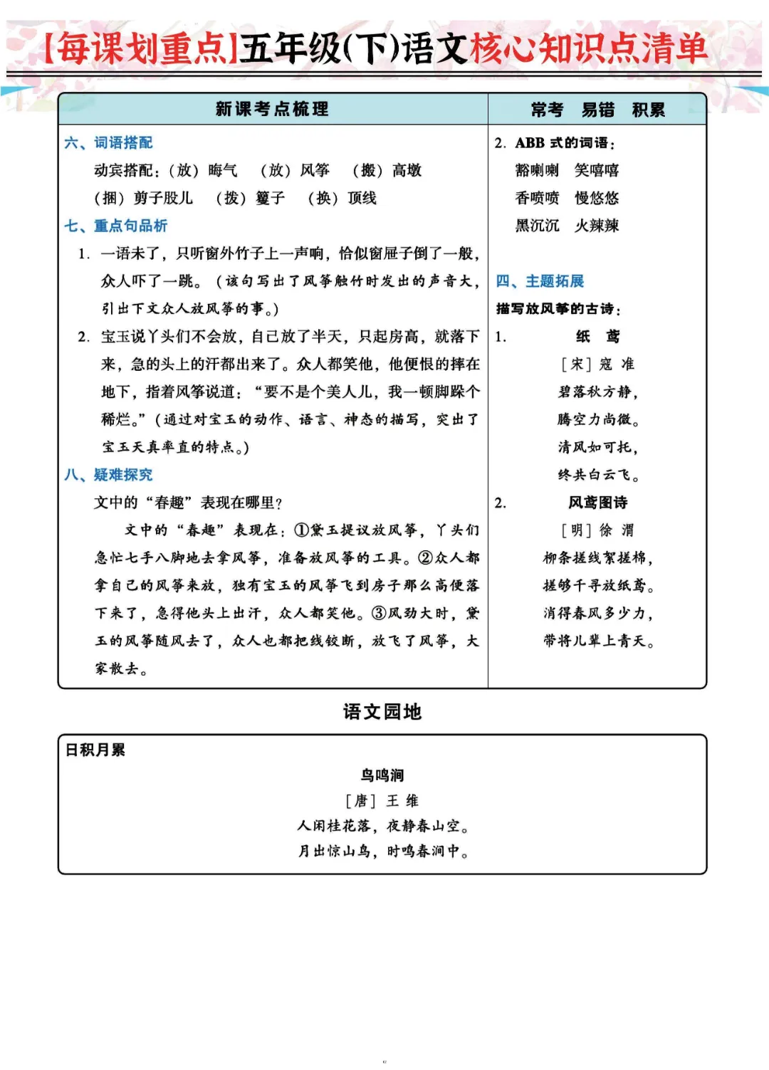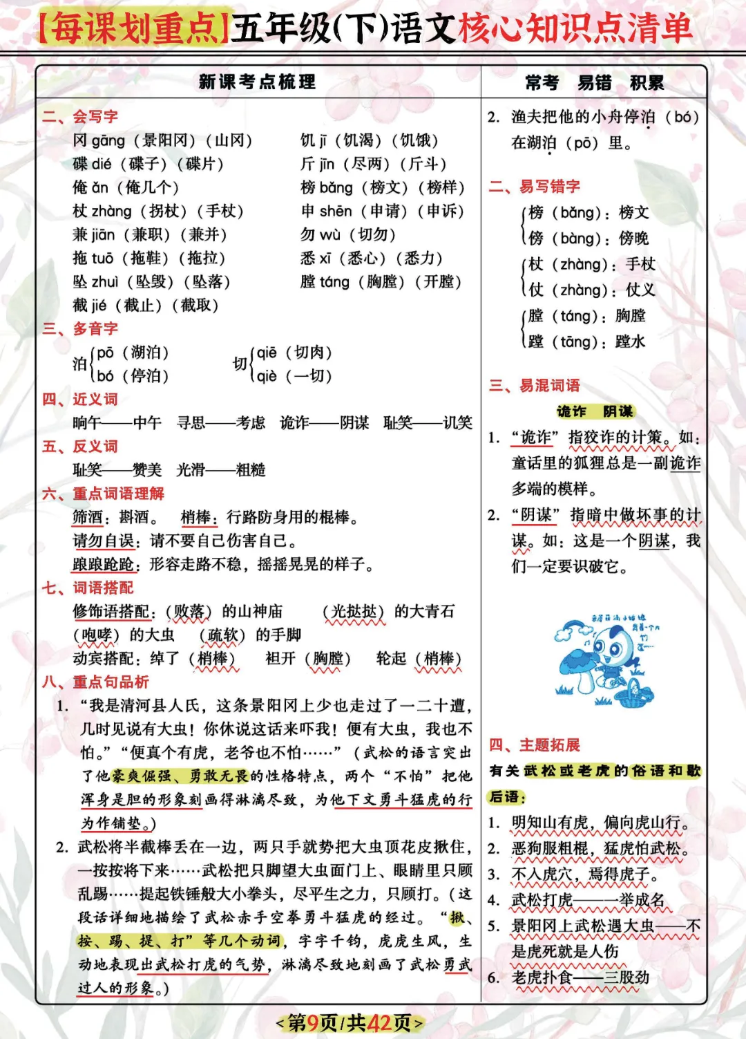五年级下册语文每课核心知识点清单(电子版可打印)