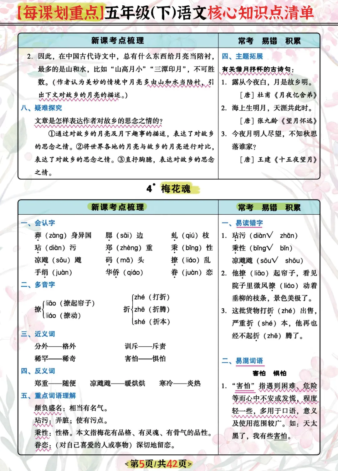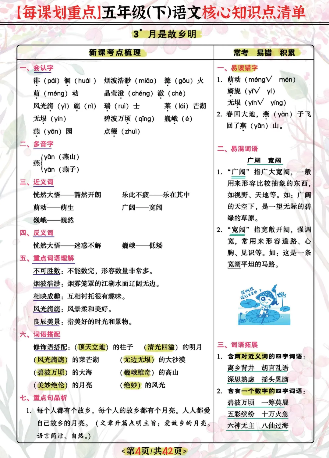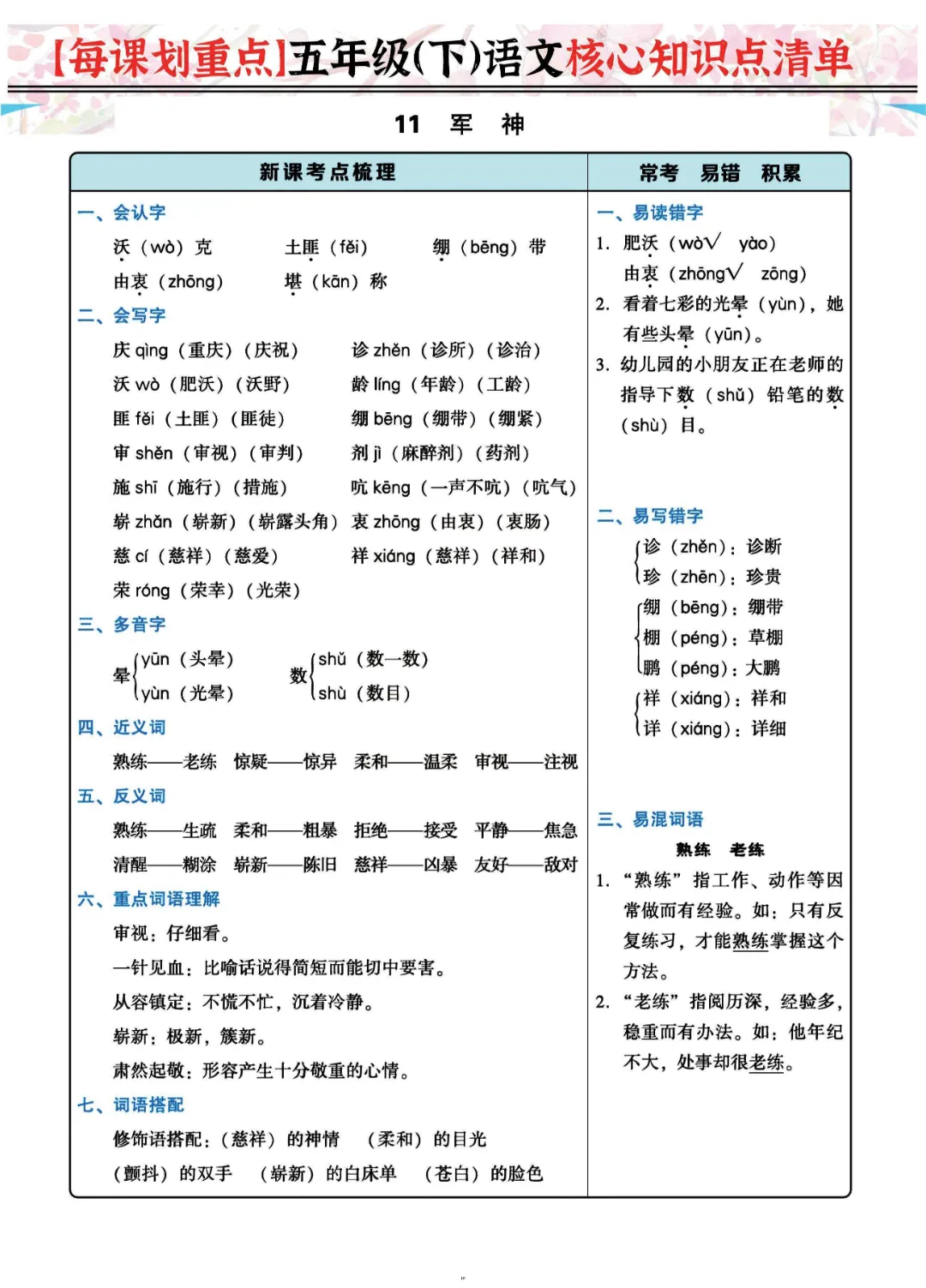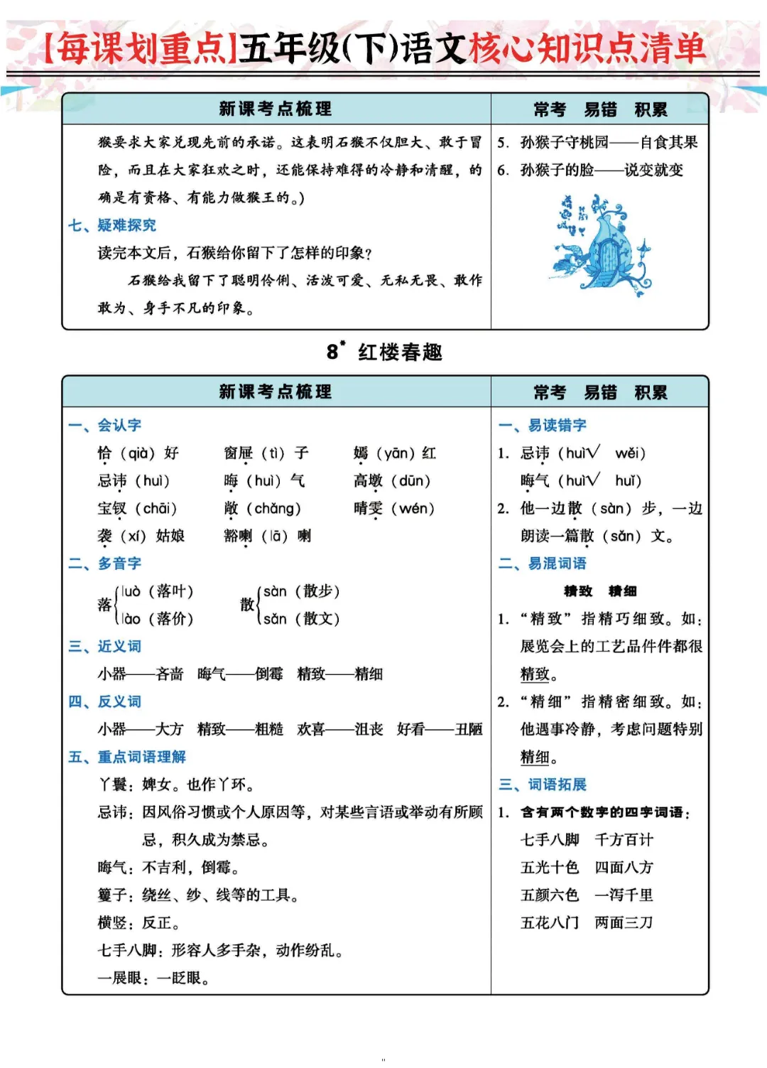 五年级下册语文每课核心知识点清单(电子版可打印)