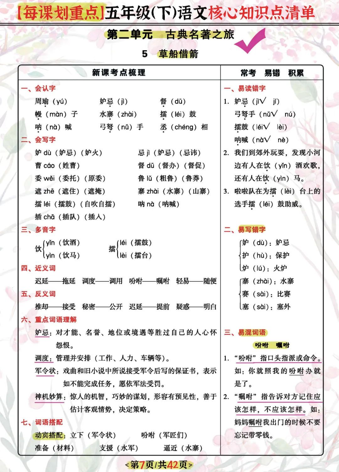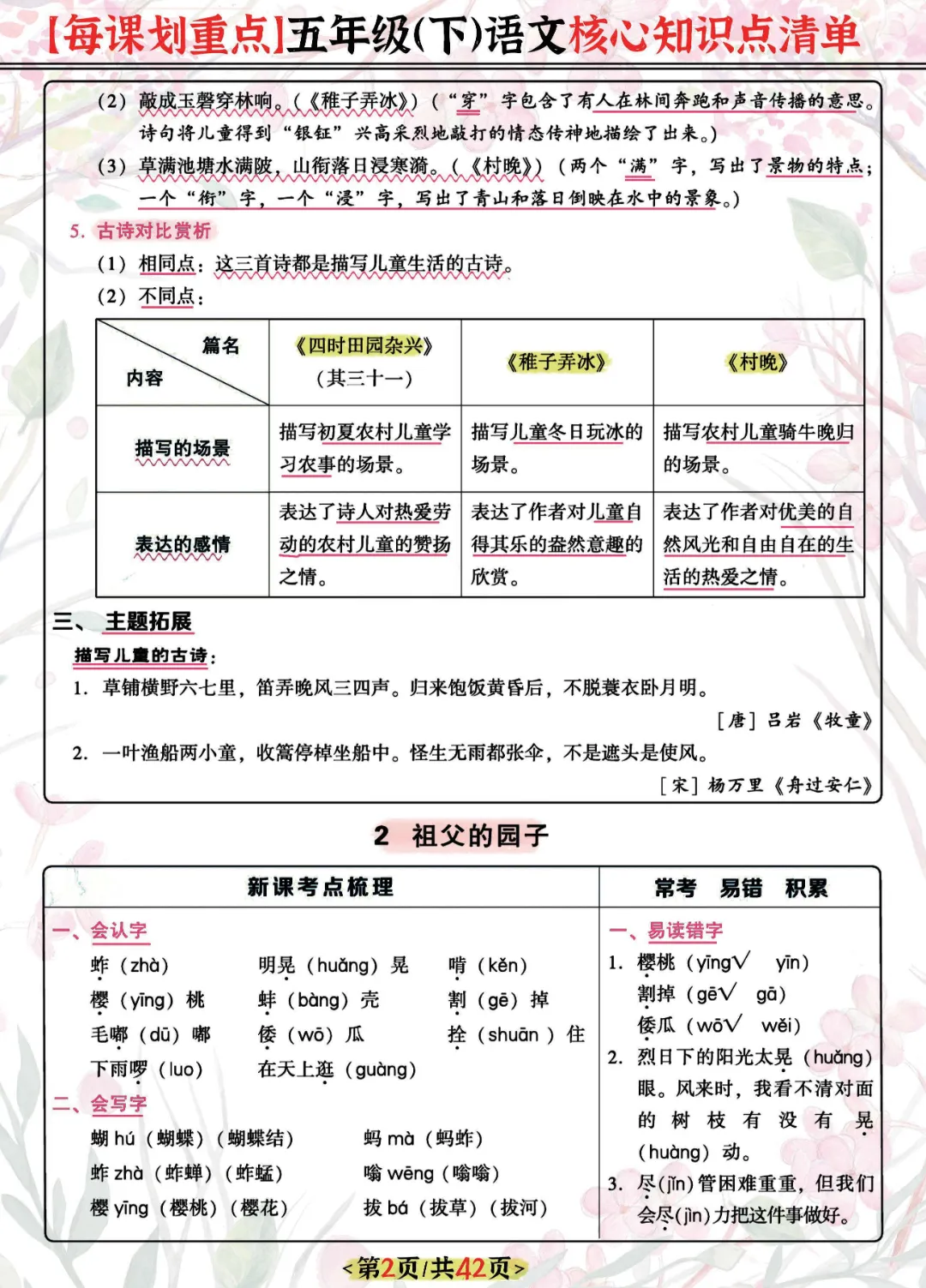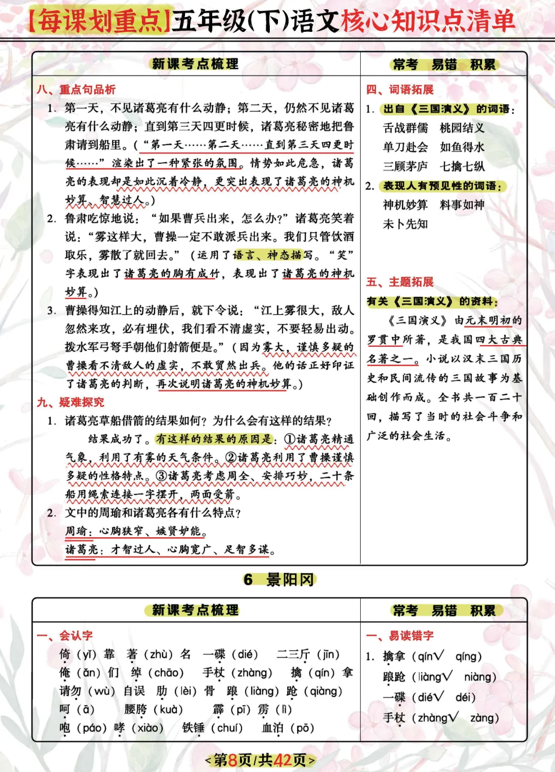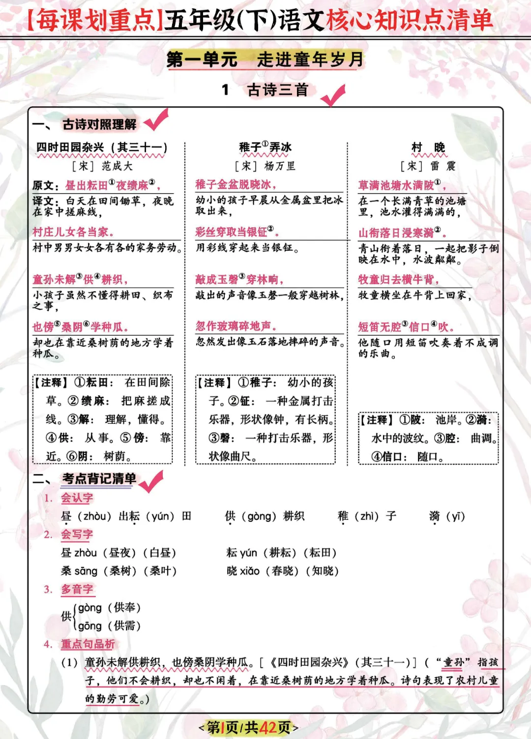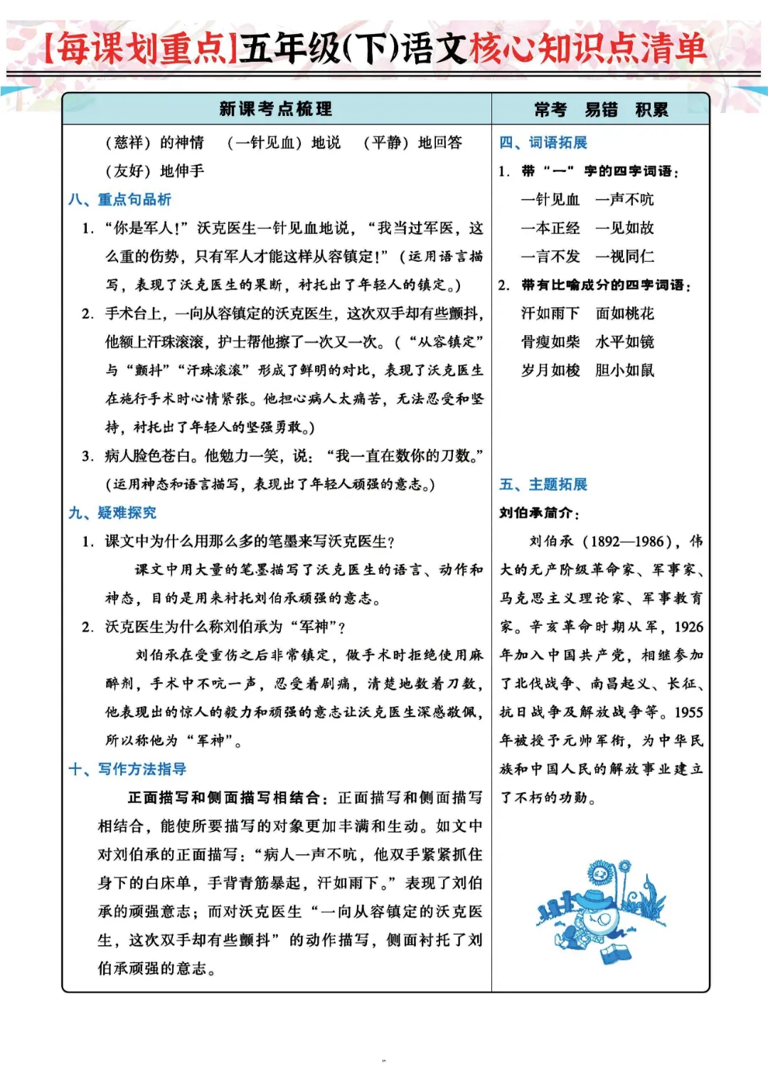 五年级下册语文每课核心知识点清单(电子版可打印)