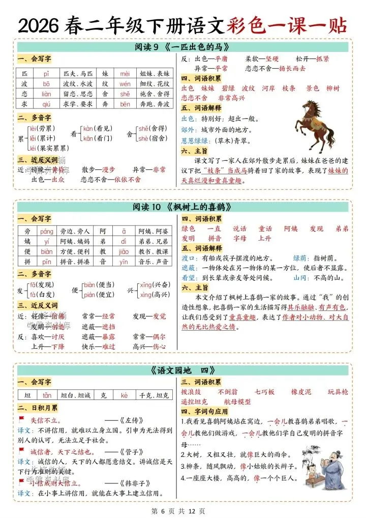 📚2026春二年级下册语文彩色一课一贴,同步课本全单元!