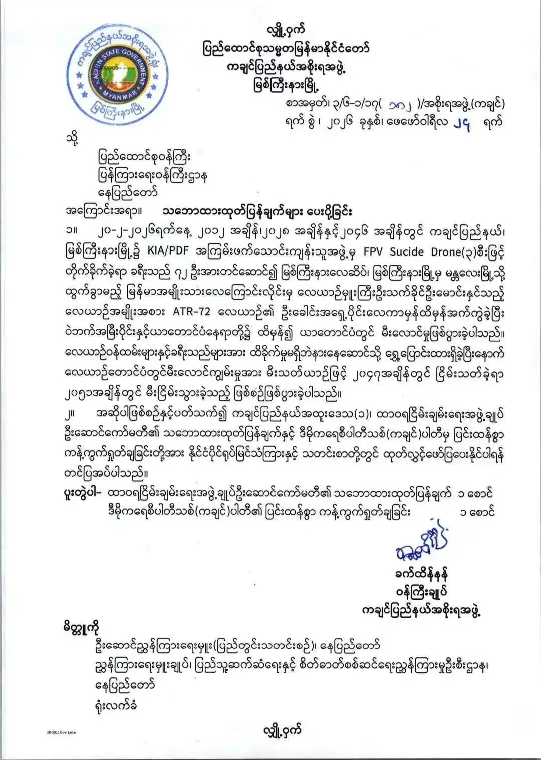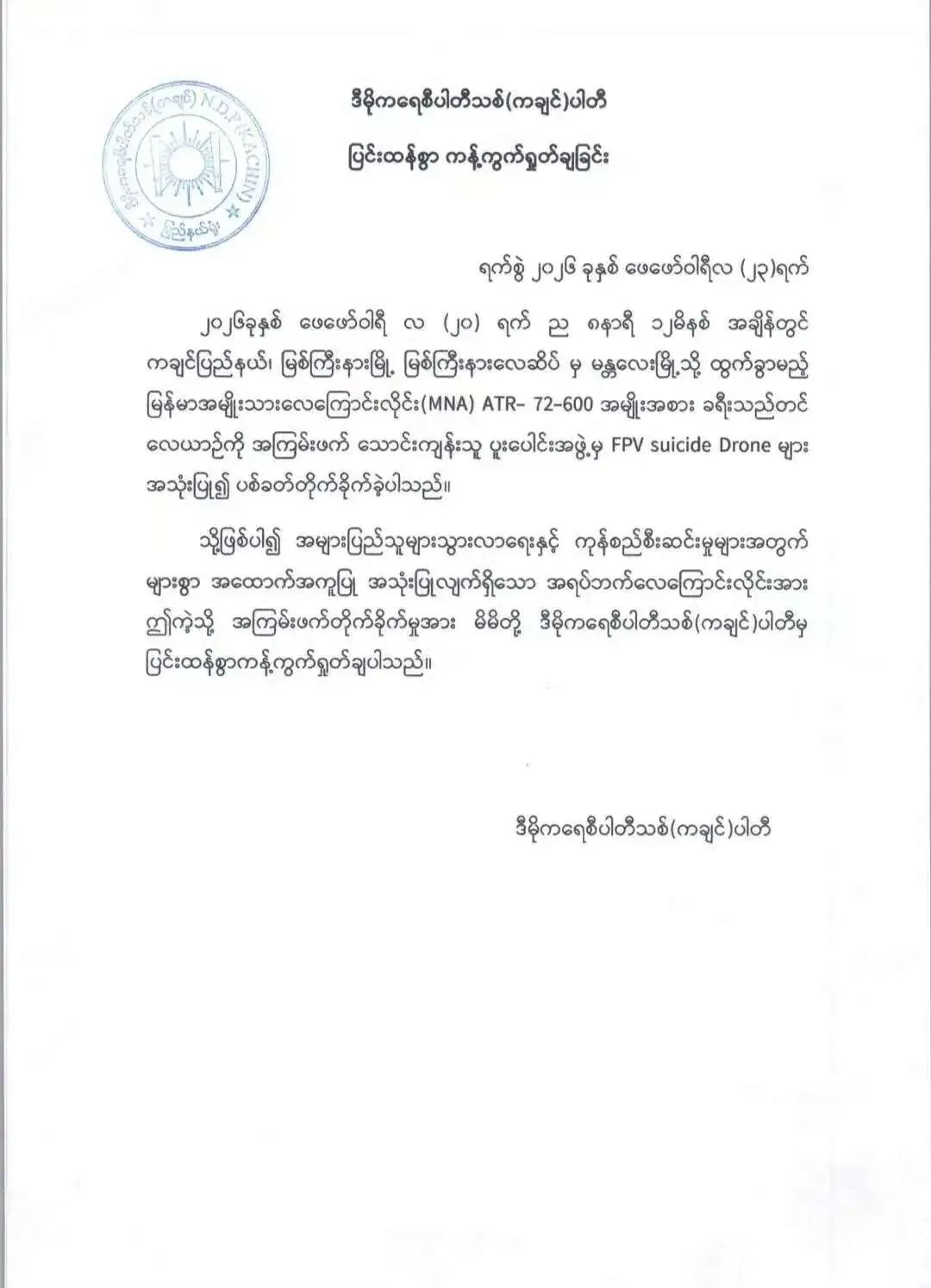 202026年2月24日,克钦独立军(KIA)与人民保卫军(PDF)恐怖叛乱组织于2月20日晚蓄意发动恐怖袭击,使用FPV自杀式无人机袭击克钦邦主要航空枢纽密支那(Myitkyina)机场客机,其暴行引发缅甸全国民众愤慨,多个组织纷纷发表声明予以强烈谴责。
