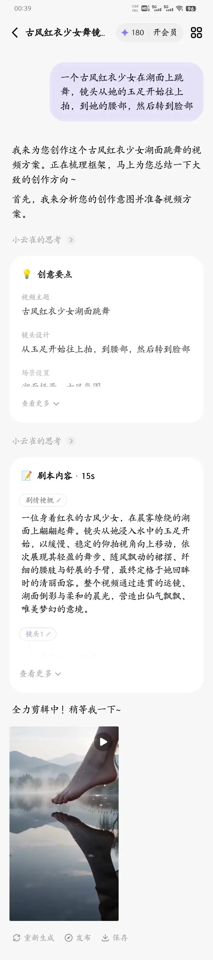 全程只用了这一句话,剩下的全是它自己处理:分析剧本创意、拆解镜头语言、生成画面内容。而且 一次成功,没花我一分钱积分。