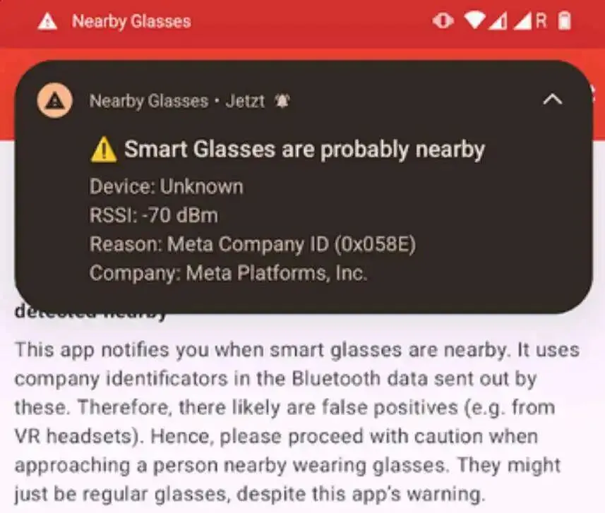 开发者Yves Jeanrenaud表示,自己因厌倦人们用智能眼镜偷拍他人的行为而创建了这款应用。据介绍,“Nearby Glasses”这款适用于安卓手机的应用会扫描Meta及其制造商Luxottica(Meta Ray-Bans的生产商)使用的独特蓝牙信号。所述应用同时能检测社交媒体应用Snapchat(其生产的智能眼镜名为Spectacles)所使用的独特信号。