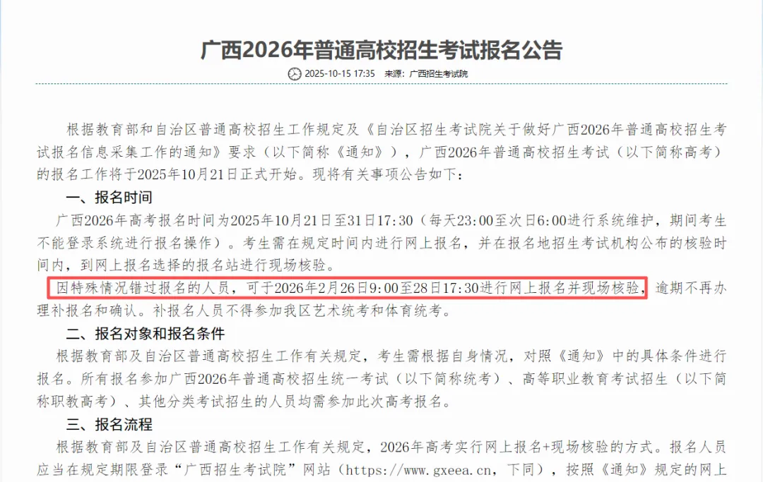根据《自治区教育厅关于做好我区2026年高等职业教育考试招生工作的通知》(桂教职成〔2025〕41号)、《自治区招生考试院关于做好广西2026年普通高校招生考试报名信息采集工作的通知》(桂考院〔2025〕214号)有关要求,广西2026年高等职业教育考试(以下简称职教高考)补报名工作将于2026年2月26日正式开始。现将有关事项公告如下:
