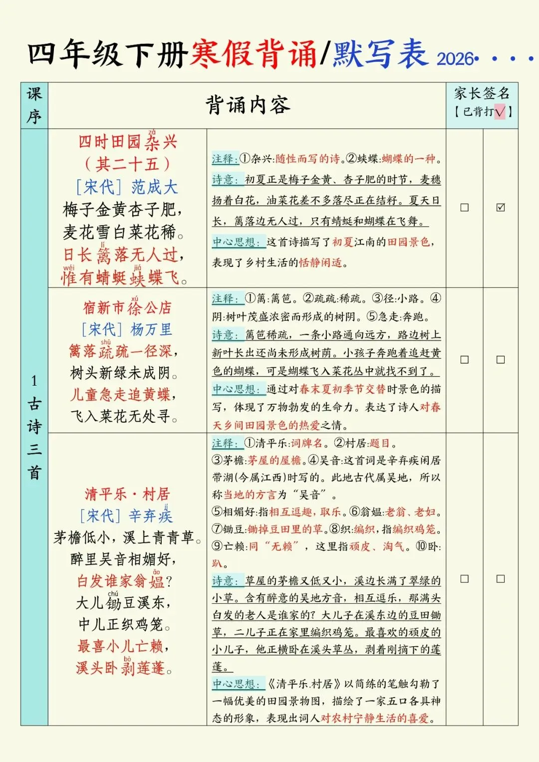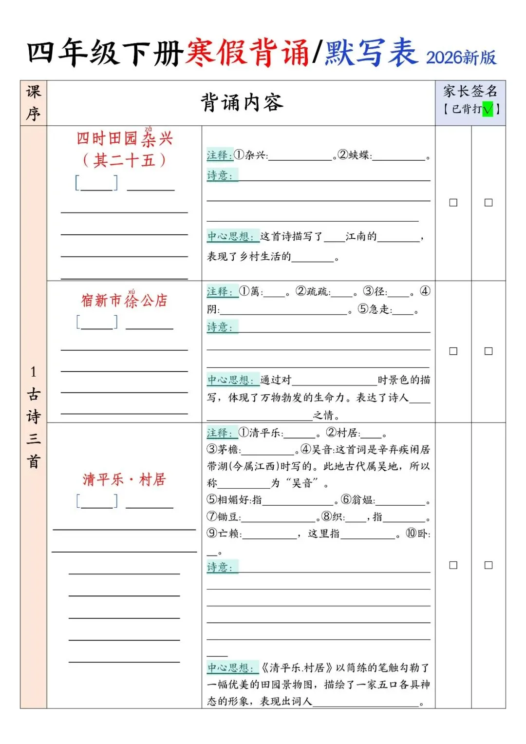 26年四年级(下)语文 寒假背诵默写表,可下载打印 文末有高清电子版领取方式 由于篇幅有限,高清完整版请下载电子版哦 领取完整电子版方式: ①:发财的小手点一点右下角“👍”和“❤️” ②:关注公众号后,在对话框中回复:001 (点击名片可直接关注)↑↑↑