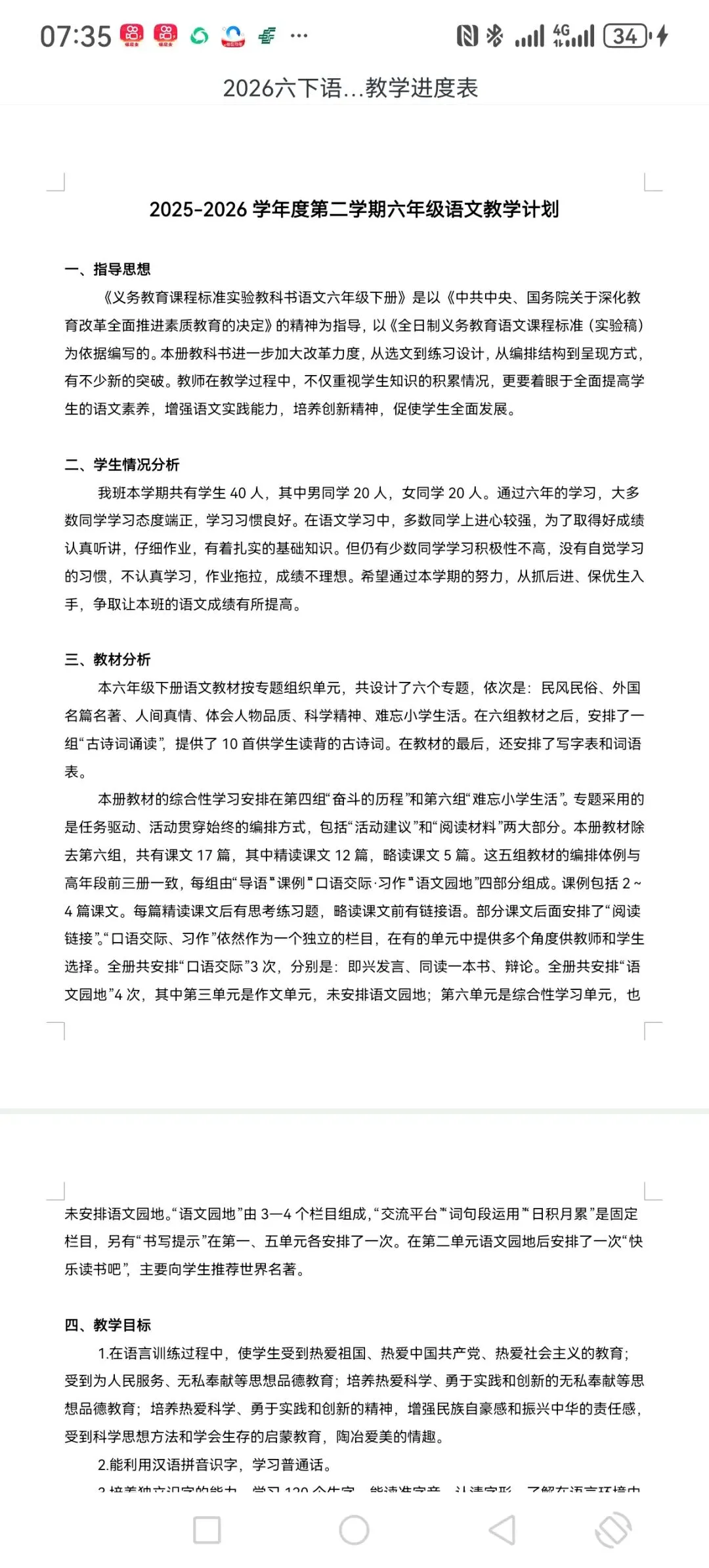 小学语文一至六年级下册教学计划整体介绍
