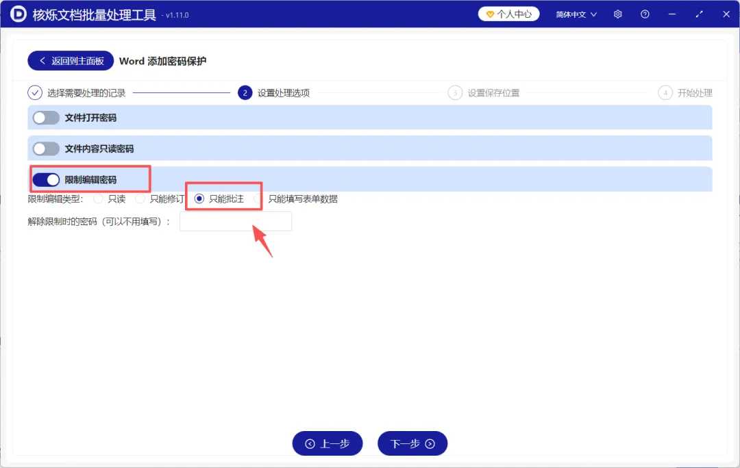 3、点击【下一步】,打开【限制编辑密码】按钮,下面勾选【只能批注】,解除限制时的密码根据需求填写。