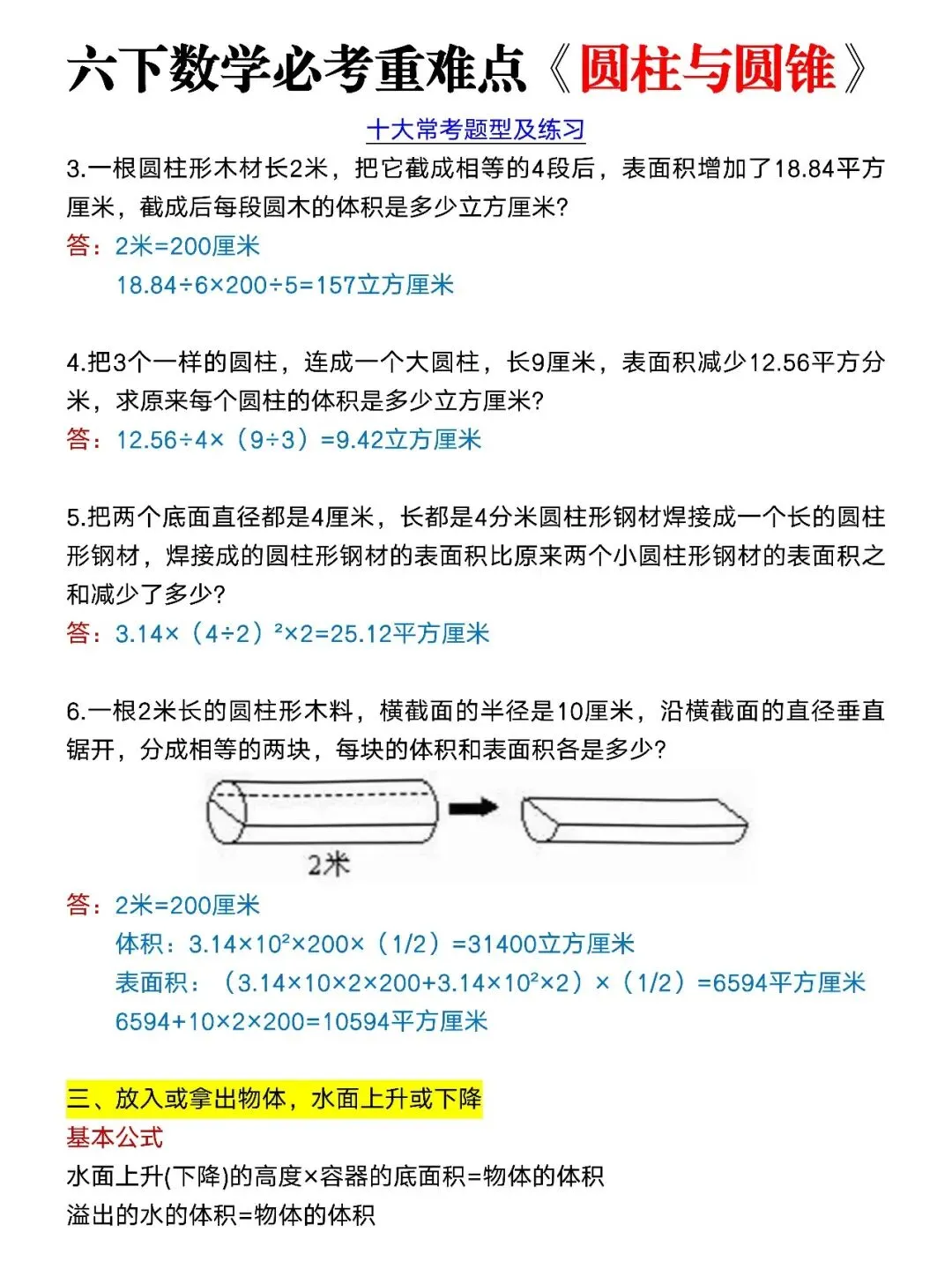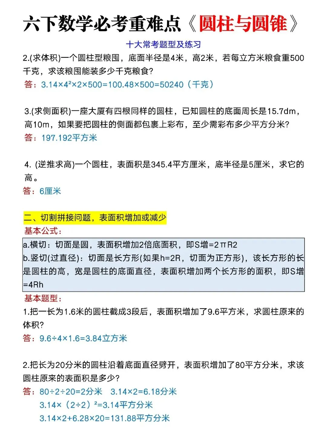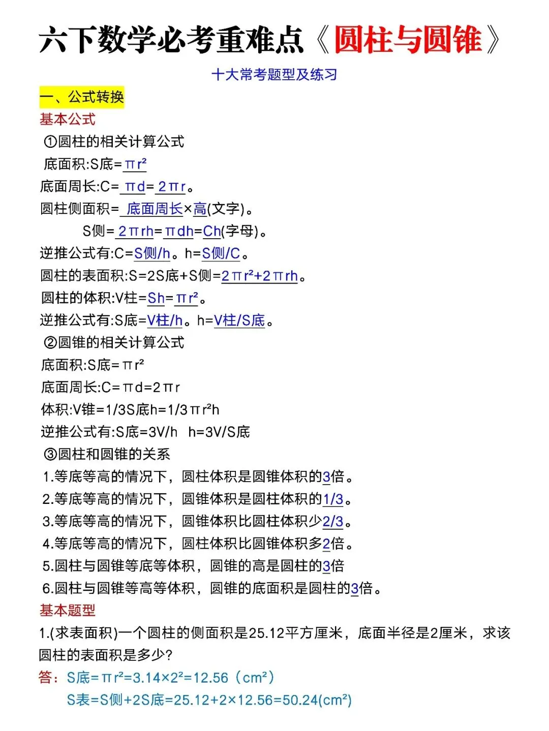 六下小升初数学圆柱与圆锥常考题型及练习;电子版可打印 大家好,我是冯婉妈妈,今天分享的是;六下《圆柱与圆锥》寒假练完开学就是黑马,关注我,每天持续分享更多的优质学习资料。 (温馨提示;因篇幅有限,仅展示部分内容。 (文末有完整版电子版领取方式) 完整电子版: ①:点一点右下角的“赞”和“在看”,感谢! ②:在公众号对话框中回复:2257 四年级下册语文《1-8单元同步写作范文》,电子版可打印,给孩子存一份吧 2026年春人教部编版语文六年级下册必背内容整理(古诗、 课文、日积月累),寒假背诵!(电子版可打印) 人教版六年级下册数学:小升初期末复习《计算题》专项练习(含答案) 三年级语文下册:《写字表》田字格字帖,拼音、部首、笔顺,有完整电子版可打印 六年级数学下册:圆柱和圆锥表面积、体积专项练习,有答案!电子版可打印