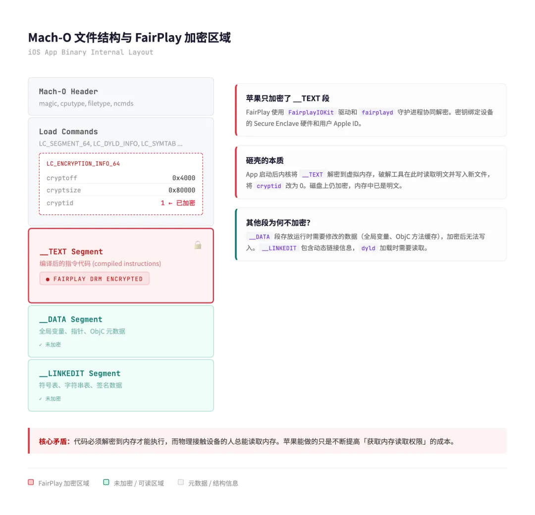 每个从 App Store 下载的二进制文件(Mach-O 格式),里面有一个叫 LC_ENCRYPTION_INFO_64 的 Load Command,记录了三个关键字段:cryptoff(加密区域的文件偏移,通常是 0x4000)、cryptsize(加密区域的长度)、以及最关键的 cryptid(1 表示已加密,0 表示未加密)。苹果只加密 __TEXT 段,也就是存放编译后指令代码的那部分,其他段像 __DATA、__LINKEDIT 和各种头信息都是明文。