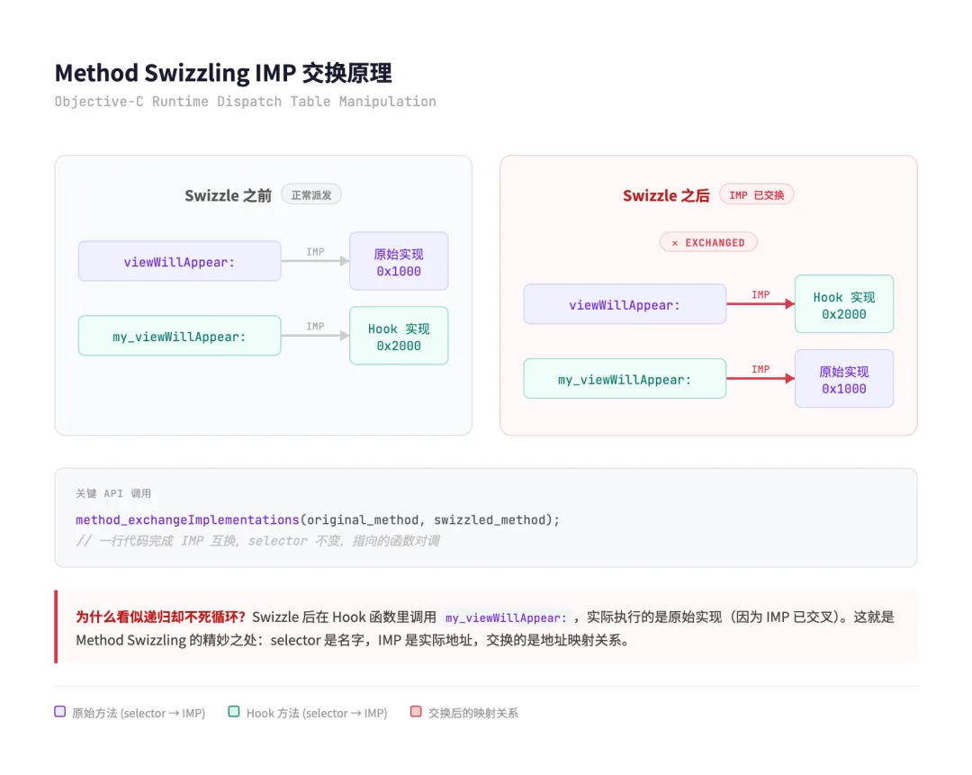 Objective-C 的消息派发机制天然适合被 Hook。每次方法调用编译后都是 objc_msgSend(receiver, selector, args...),运行时维护着一张可修改的派发表,映射 selector(方法名)到 IMP(函数指针)。Method Swizzling 做的事情就是调用 method_exchangeImplementations() 把两个方法的 IMP 互换。互换之后,调用原方法名实际执行的是你的替换函数,调用你的方法名反而执行原函数。这就是为什么 swizzle 代码里看似「递归调用自己」实际不会死循环,因为 IMP 已经交叉了。