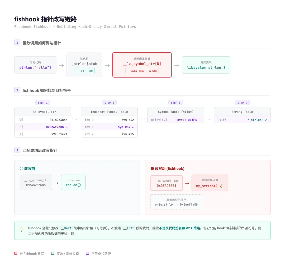 对于 C 函数层面的 Hook,Facebook 开源的 fishhook 只有大约 250 行代码,却极其精妙。iOS 的 Mach-O 二进制对外部符号使用位置无关代码,函数调用经过 stub 跳转,stub 里读取的函数指针存放在 __DATA 段的 __la_symbol_ptr(延迟绑定)和 __nl_symbol_ptr(非延迟绑定)区域。动态链接器 dyld 在加载时把真实地址写进去。fishhook 顺着间接符号表的链条找到目标符号名,直接改写 __DATA 段里的指针值指向替换函数。因为修改的是可写的数据页,不会违反 W^X 策略或代码签名。不过 fishhook 有个关键限制:它只能 hook 动态链接的外部符号,同一个二进制内部定义的函数它动不了。