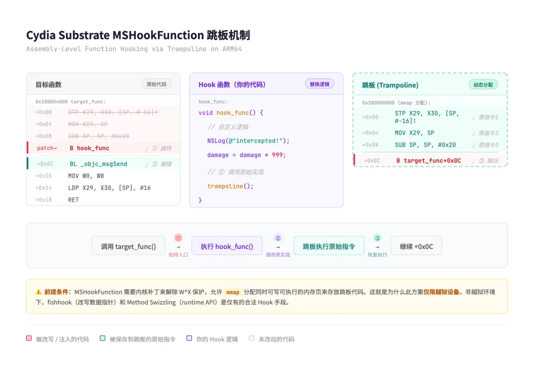 越狱环境下的 Cydia Substrate(saurik 开发)就没这个限制了。它的 MSHookFunction 直接在汇编层面操作:把目标函数开头的几条指令替换成一个跳转指令(trampoline),跳到替换函数;同时在另一块可执行内存里保存被替换的原始指令加上一个跳回去的跳转,这样替换函数里还能调用原始实现。这需要内核补丁来绕过 W^X 保护,所以只有越狱设备才能用。