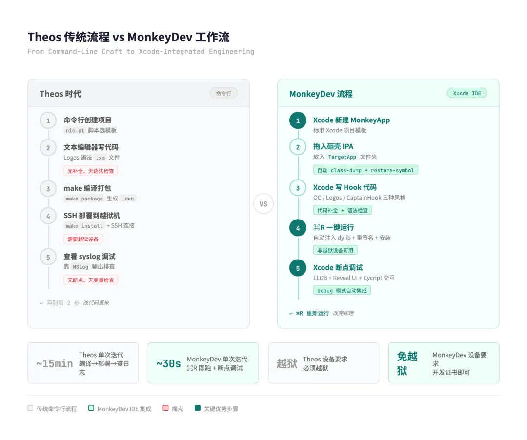 2017 年,猴神发布了 MonkeyDev(GitHub 6.7k star),彻底改变了 iOS 逆向开发的工作方式。MonkeyDev 自称是 iOSOpenDev 的升级版,但实际做的事情远超「升级」二字。它解决的核心问题是:把 iOS 逆向分析从一堆零散的命令行工具,变成了一个完整的、基于 Xcode 的 IDE 级开发体验。