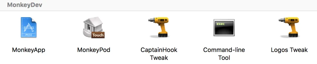 具体来说,MonkeyDev 安装后会在 Xcode 的新建项目菜单里注册四个模板。其中最核心的是 MonkeyApp:你新建一个 MonkeyApp 项目,把砸壳后的 IPA 拖进 TargetApp 文件夹,配好开发证书,按 ⌘R 就能把目标 App 连带你的 Hook 代码一起编译、注入动态库、自动重签名、安装到非越狱手机上运行。整个过程和你平时开发自己的 App 几乎一样。