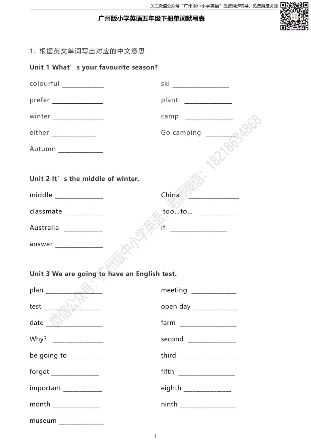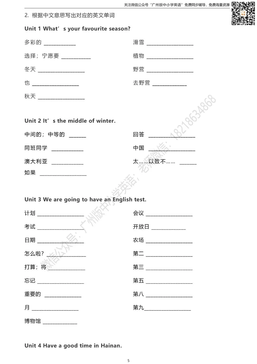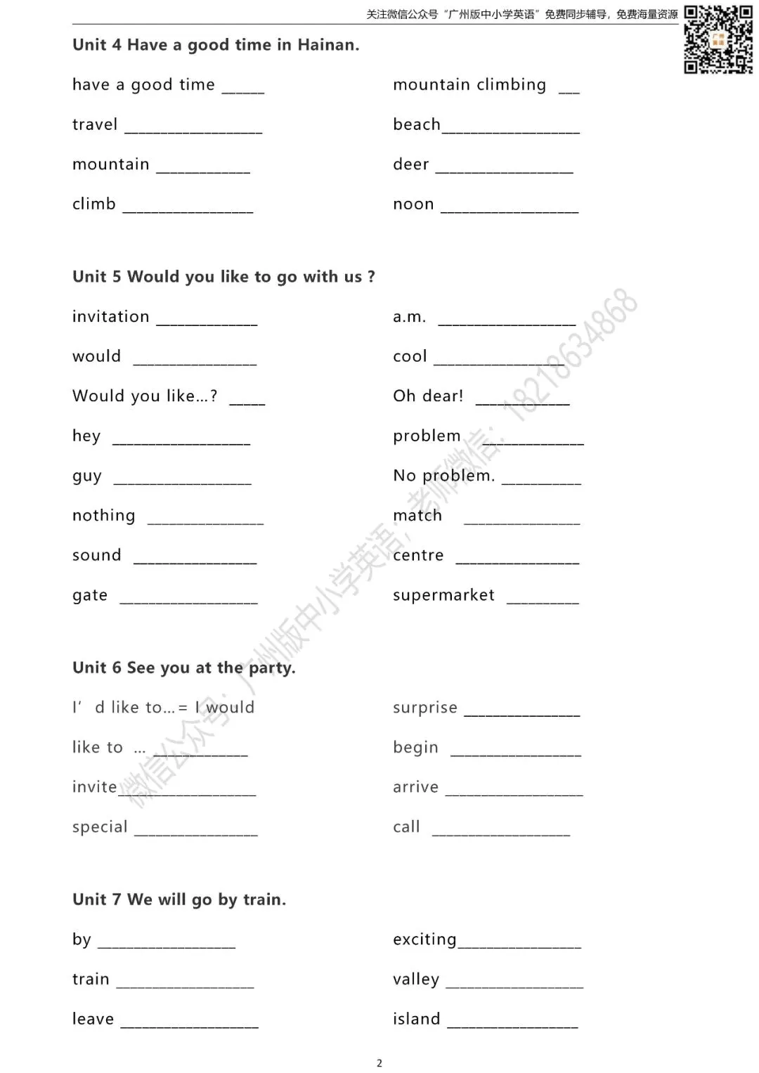 怎样获取练习题的打印版? 扫描下方二维码 进入“广州版中小学英语”微信公众号 点击公众号首页左下方键盘图标 发送消息“五年级单词默写表” 即可获取打印版(不是在留言区哦) 广州版英语1-6年级课本点读/课本视频 沪教版英语7-9年级课本音频/背单词 课本同步练口语