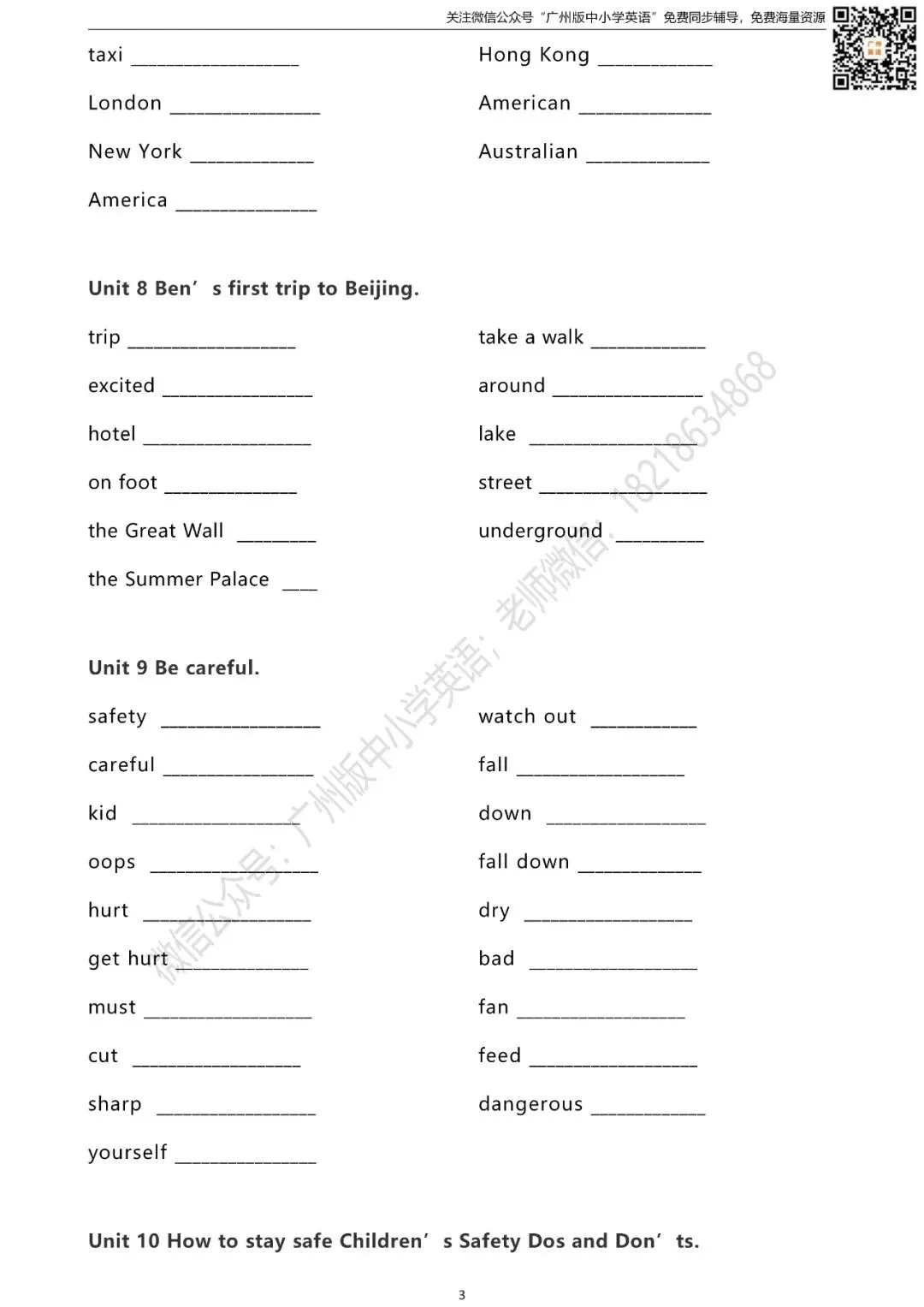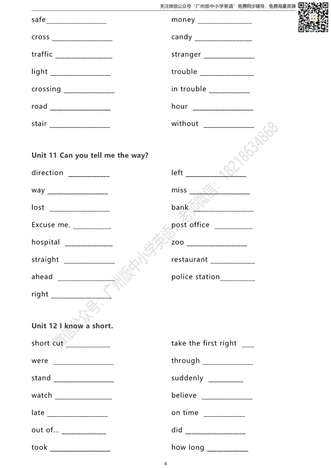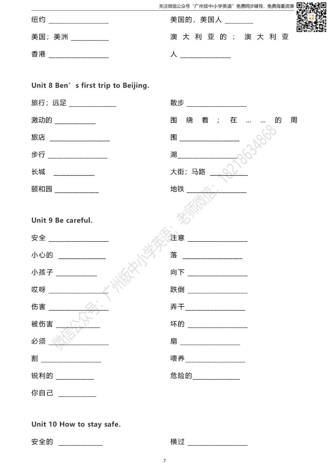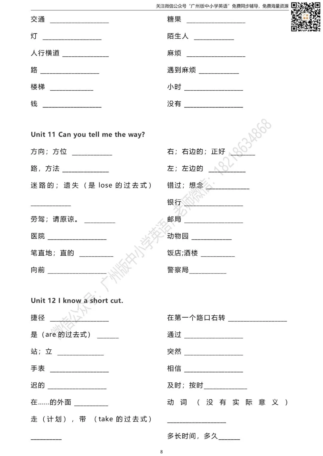 怎样获取练习题的打印版? 扫描下方二维码 进入“广州版中小学英语”微信公众号 点击公众号首页左下方键盘图标 发送消息“五年级单词默写表” 即可获取打印版(不是在留言区哦) 广州版英语1-6年级课本点读/课本视频 沪教版英语7-9年级课本音频/背单词 课本同步练口语